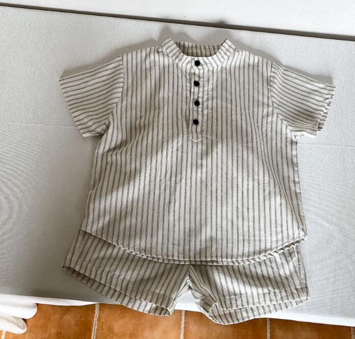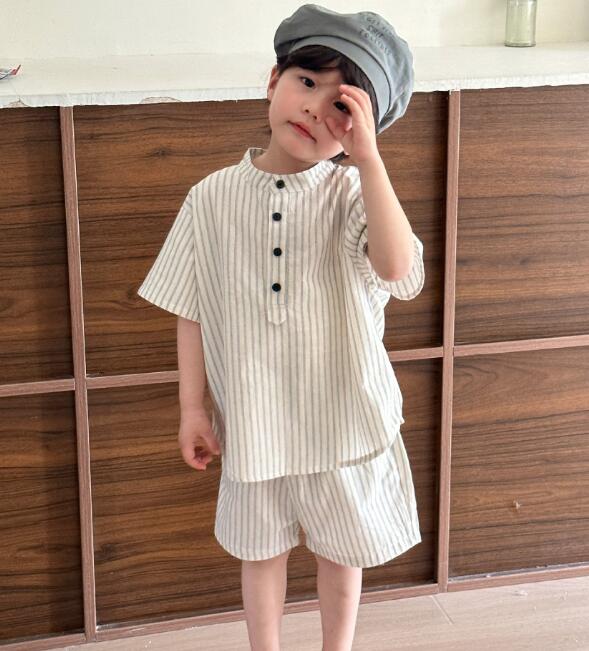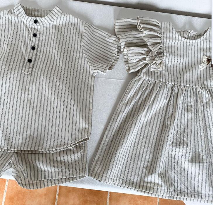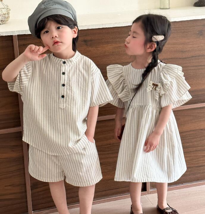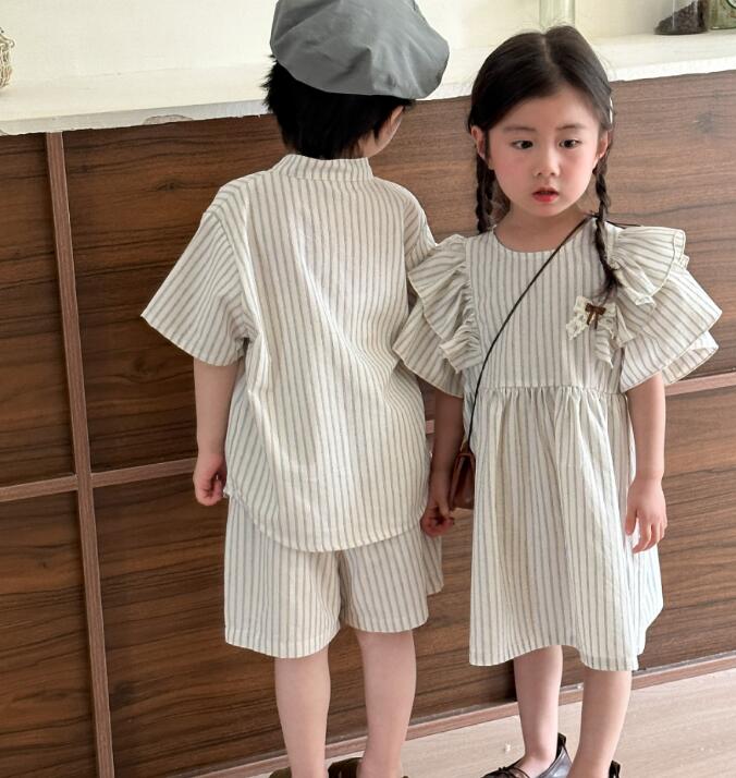男の子用は半袖シャツとショートパンツ、女の子用はフリル袖のロングワンピースをご用意。