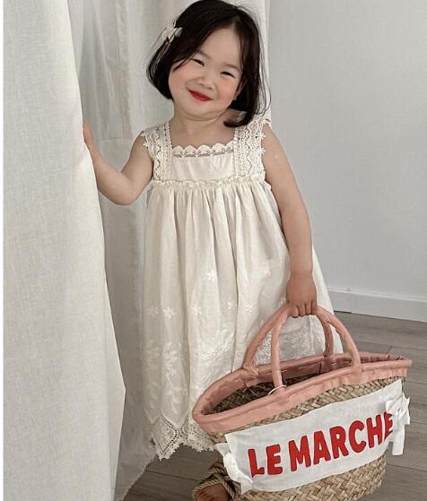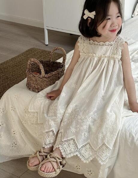 上品な花柄刺繍とレース装飾が美しいキッズ用ロングワンピースです。