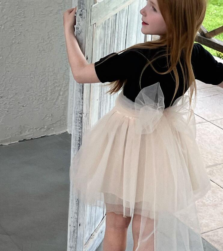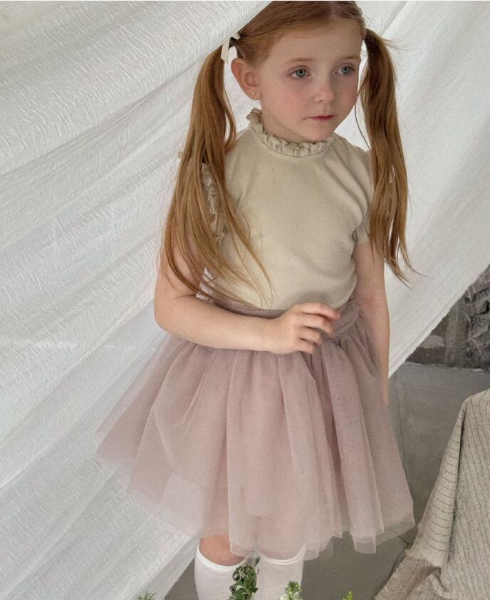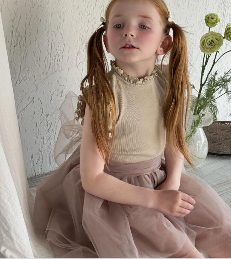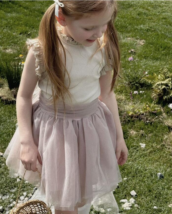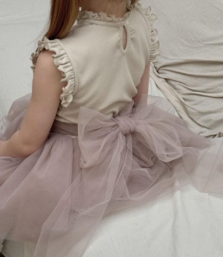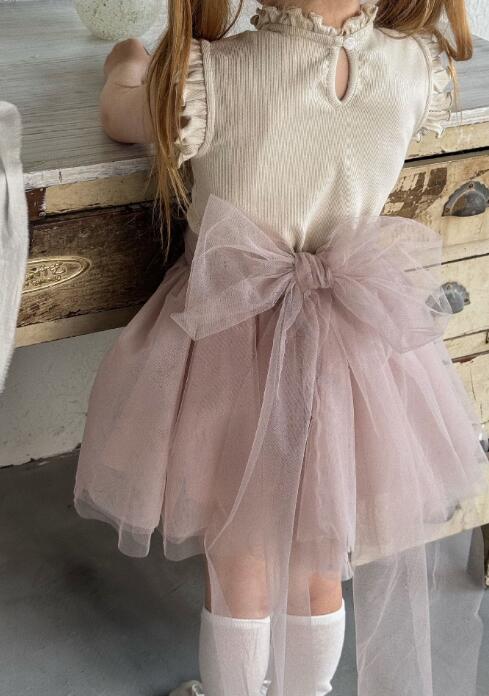 上品なベージュ色のトップスにふんわりとしたチュール素材のスカートを組み合わせました。