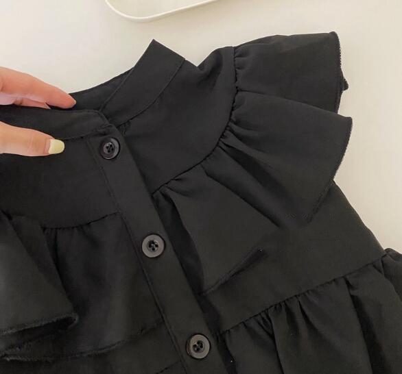 襟元と袖部分の可愛らしいフリルデザインが特徴的で、前面のボタン仕様でお着替えも簡単です。