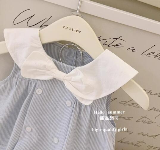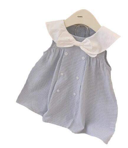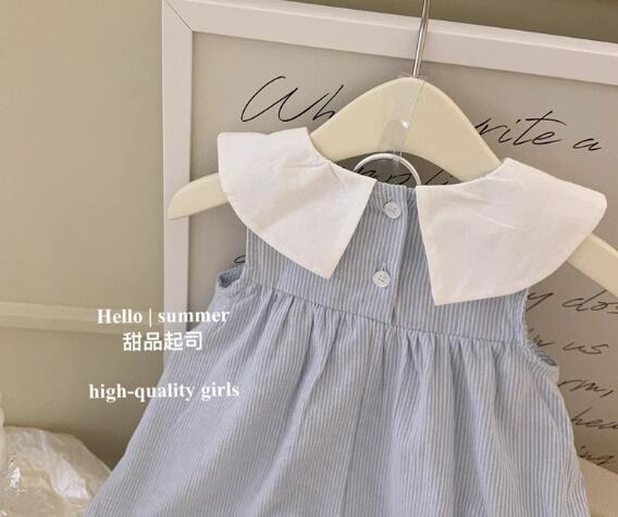 可愛い白い襟がポイントのキッズ用ロングワンピースです。 爽やかなストライプ柄とボタンデザインが上品な印象を演出します。 90センチから140センチまでサイズ展開豊富で、 普段着からお出かけまで幅広く活躍する一枚です。