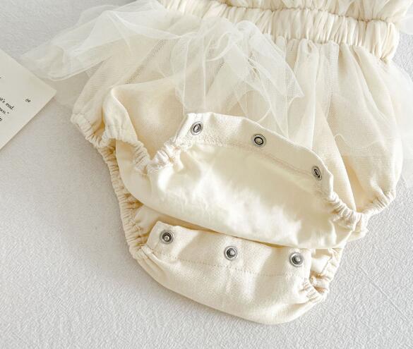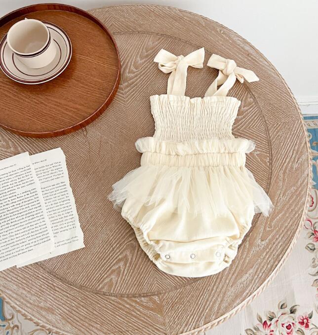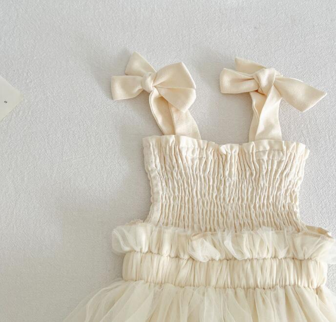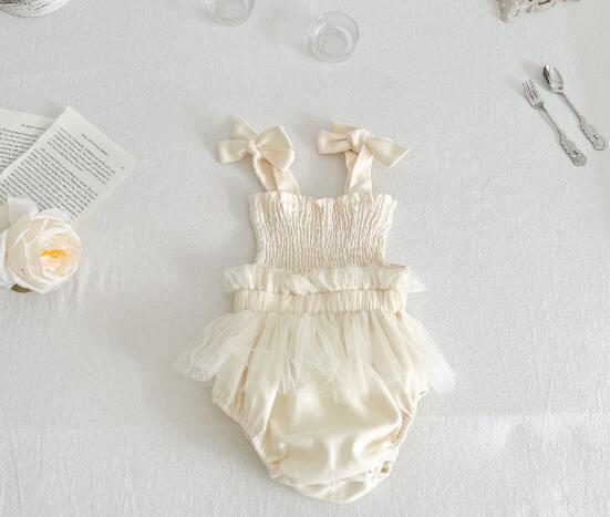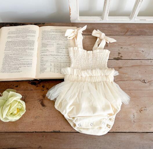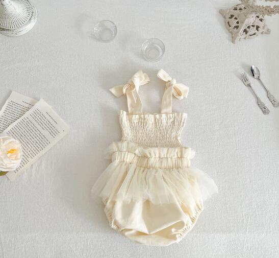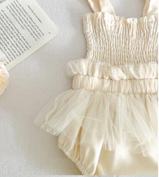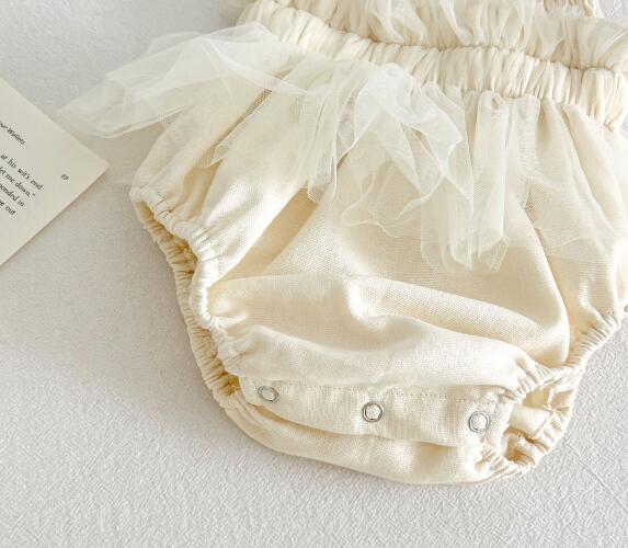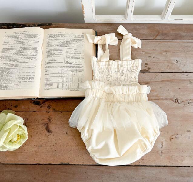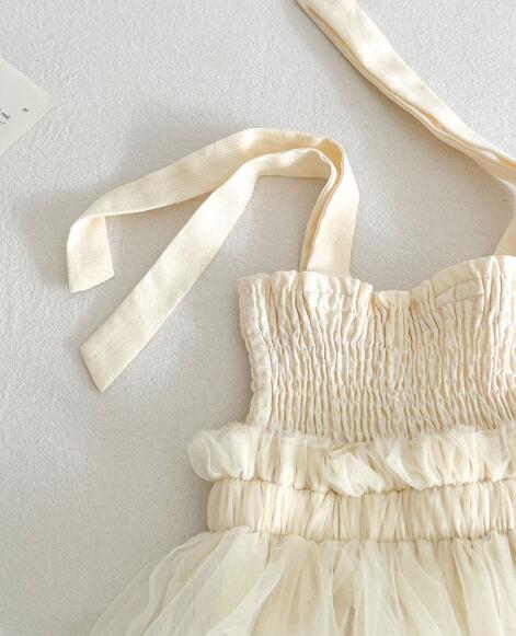 ふわふわのフリルが可愛らしいキッズ用ガーターロンパースです。 肩紐にはリボンが付いて、まるでロングワンピースのような上品な仕上がり。 シャーリング加工で着心地も抜群、夏のお出かけにぴったりです。