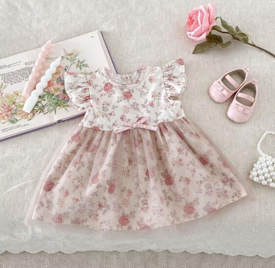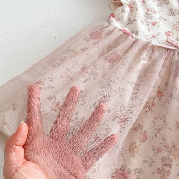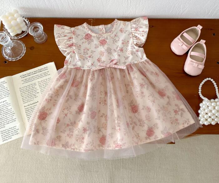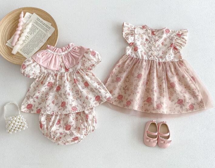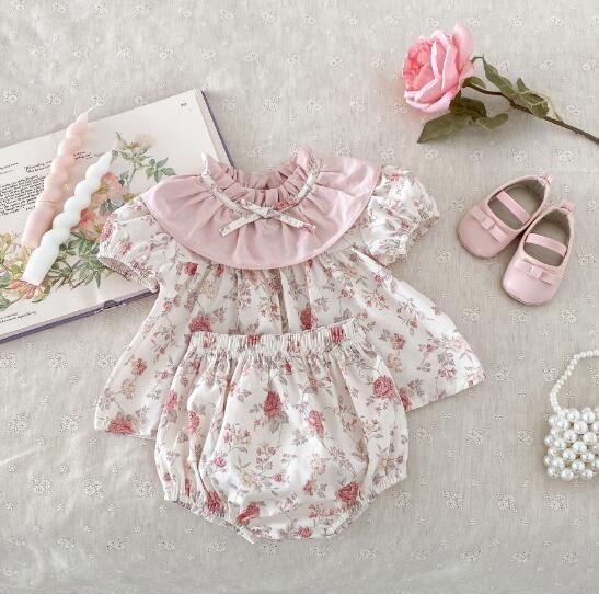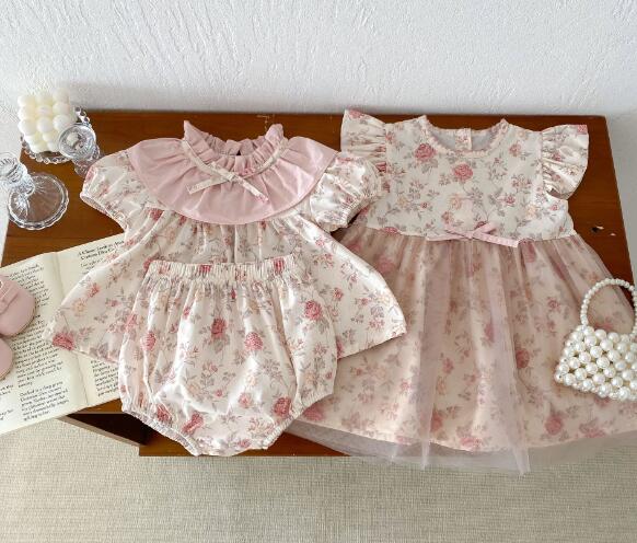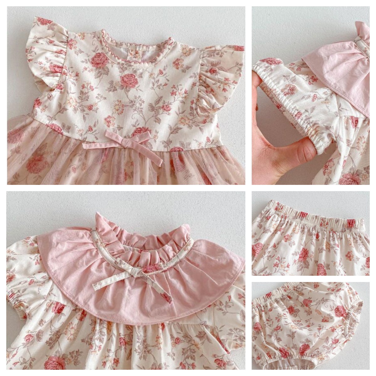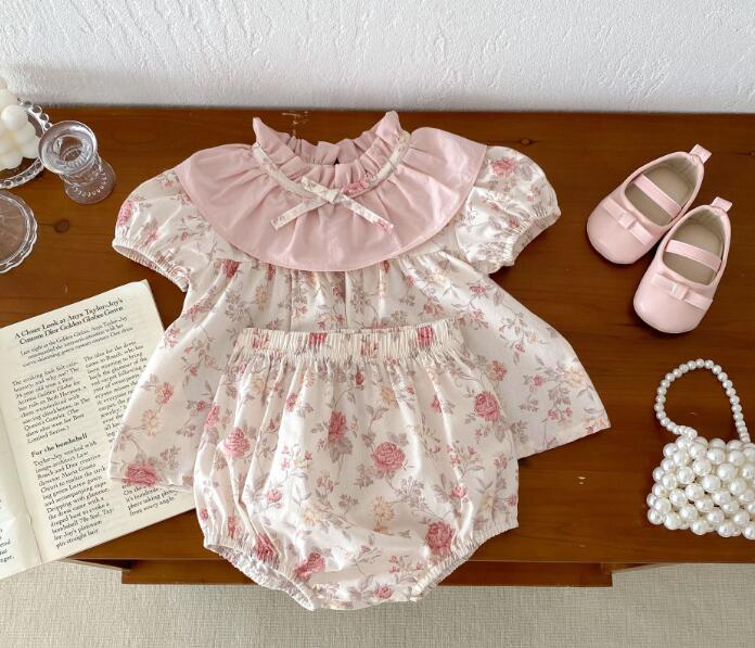 可愛い花柄が印象的なキッズ向けの夏用セットアップです。 襟付きワンピースとブルマーのセットで、優雅なロングワンピース風のシルエットが特徴的。 ピンクの襟とフリル袖がアクセントになった上品なデザインで、特別な日のお出かけにもぴったりです。