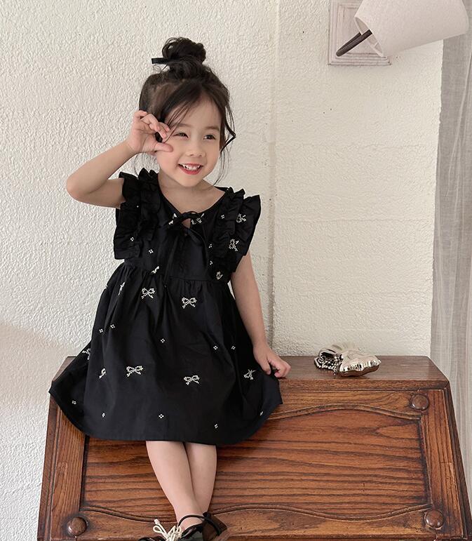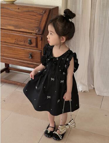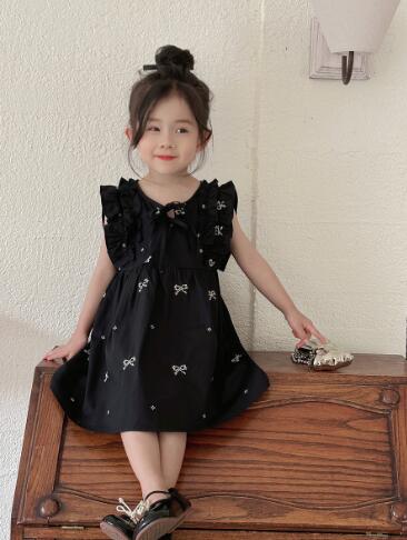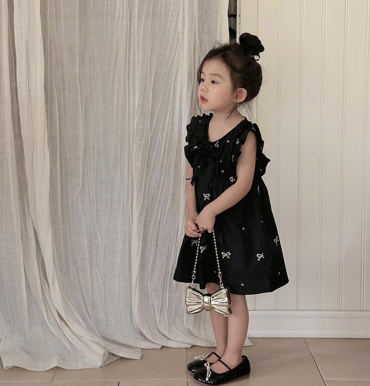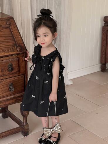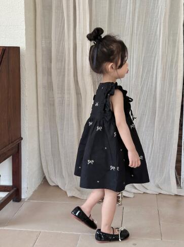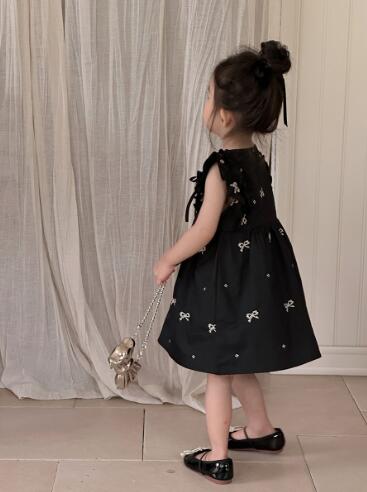 キッズ向けの上品で可愛い黒色ロングワンピースです。 全体に散りばめられた白いリボン柄が女の子らしさを演出し、 袖なしデザインで動きやすく快適な着心地を実現しました。 九十から百五十サイズまで対応で、お出かけや特別な日にも最適です。