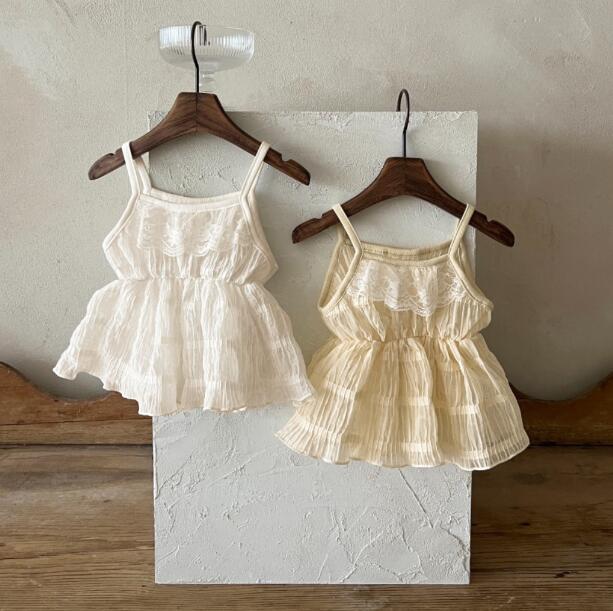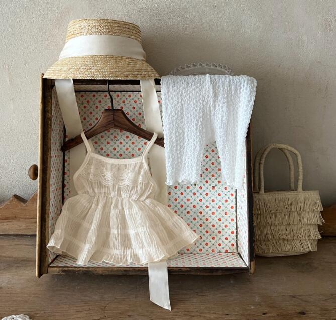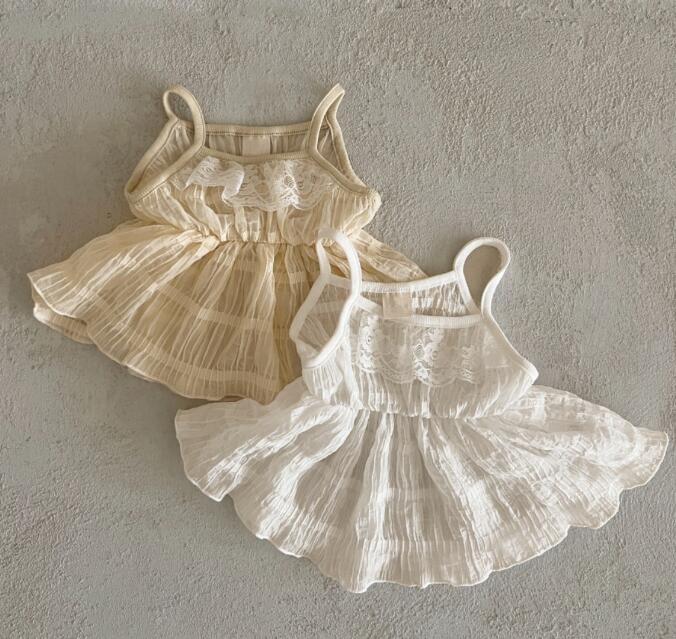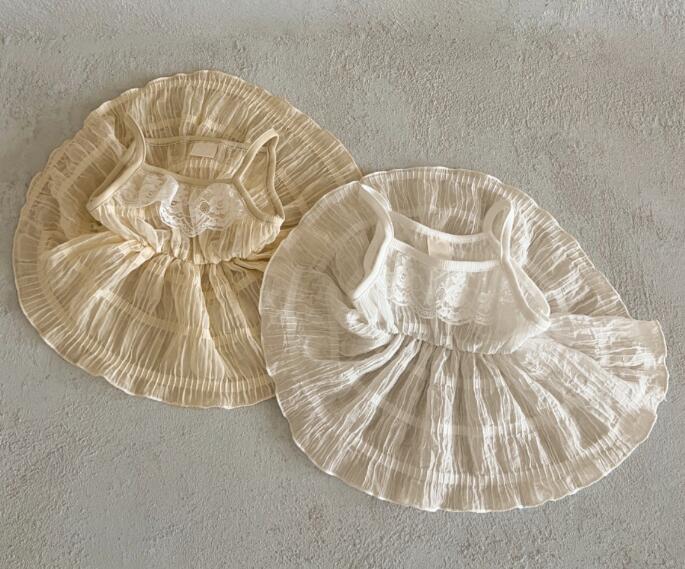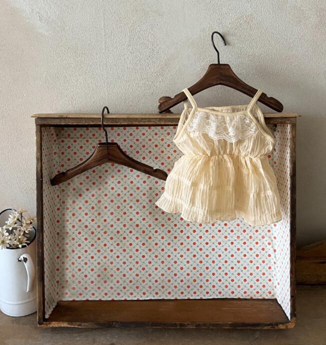 細い吊りひもと胸元のギャザーが女の子らしさを演出します。