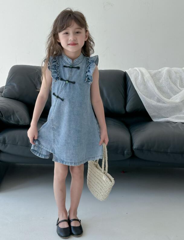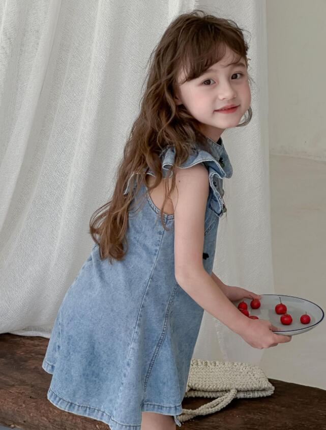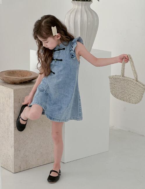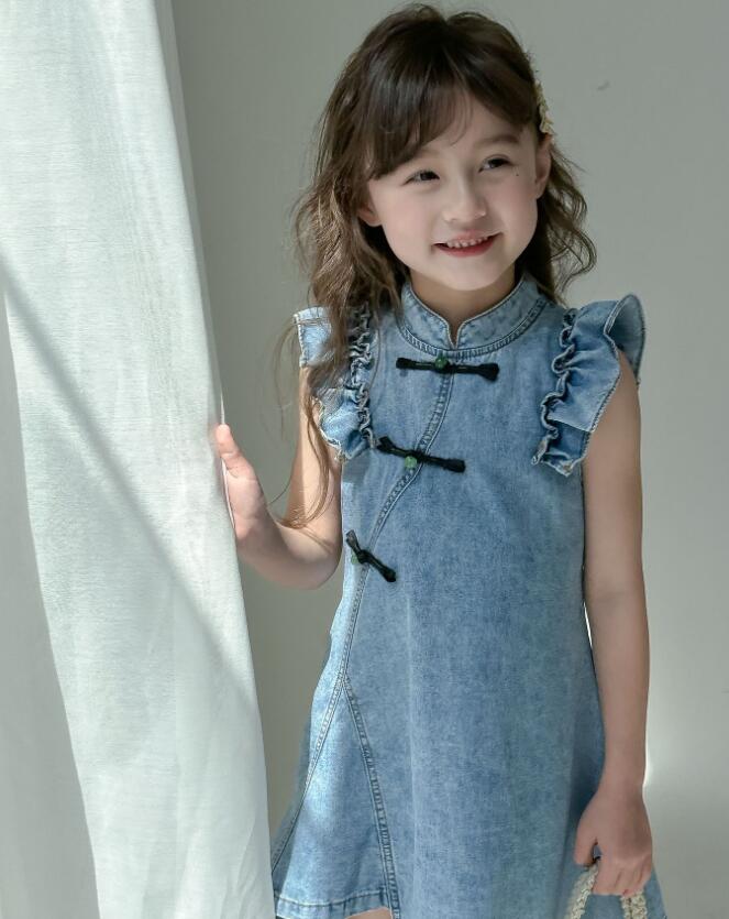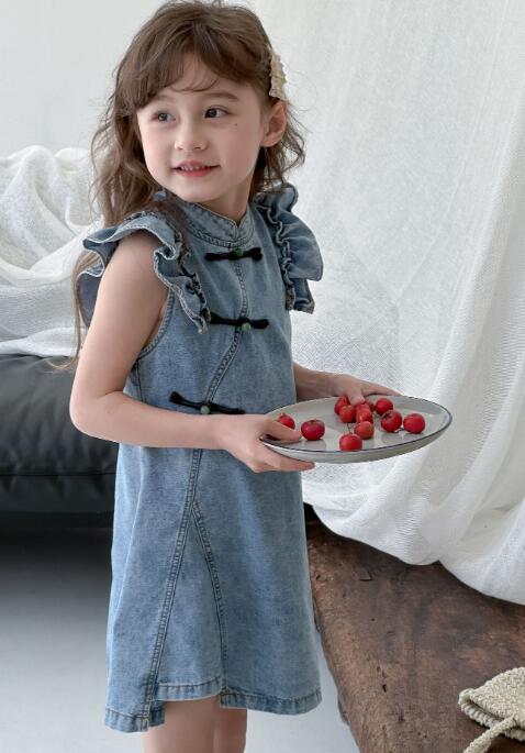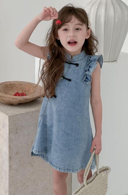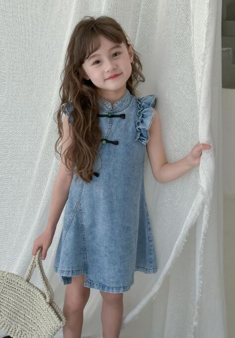 可愛いフリル袖とチャイナボタンが特徴的なキッズ向けデニムワンピースです。 上品なロングワンピースのデザインで、普段着からお出かけまで幅広くお使いいただけます。 柔らかなデニム素材で着心地も抜群です。