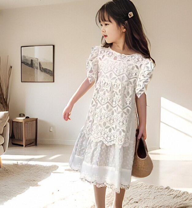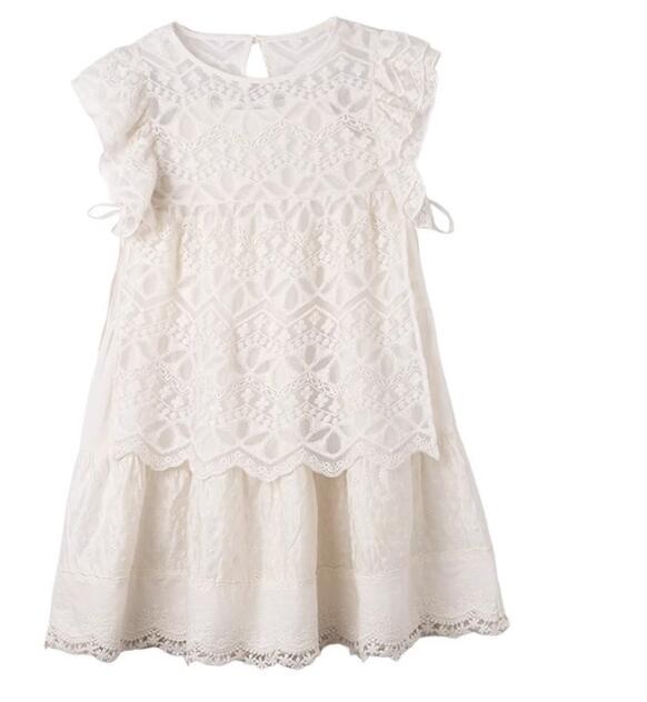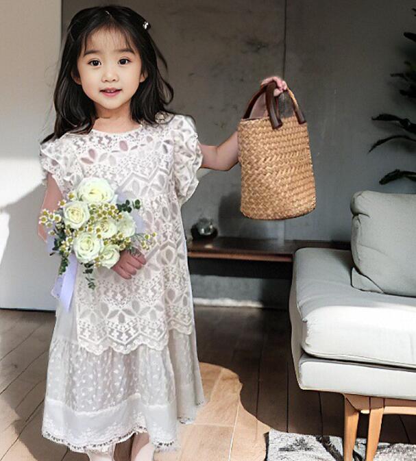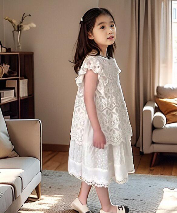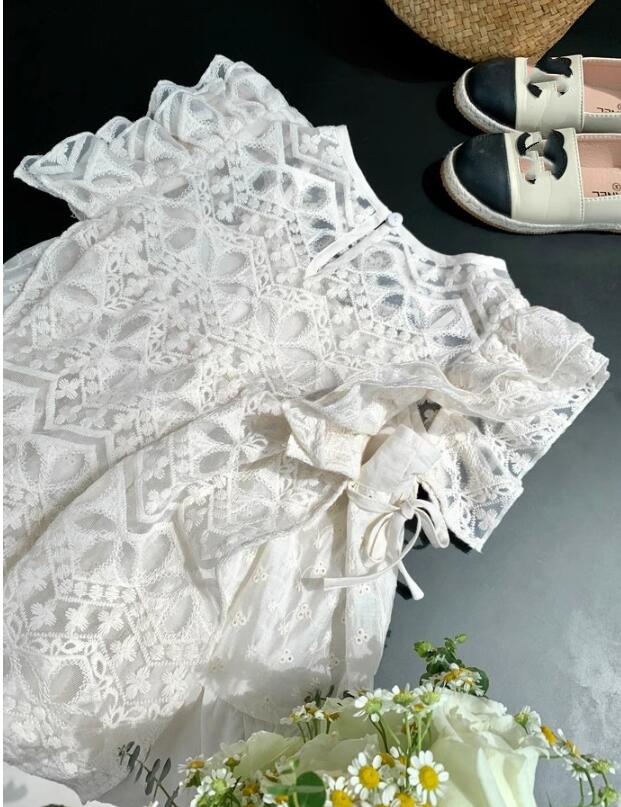 白いレースの繊細な模様とフリル袖がお子様を可愛らしく演出します。