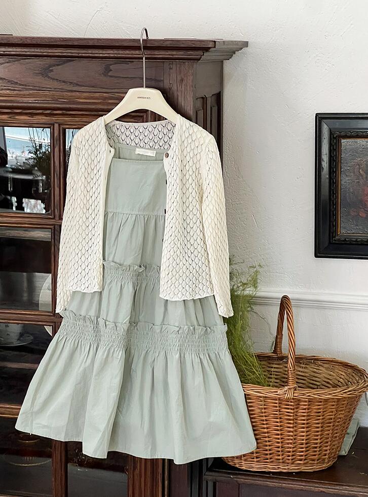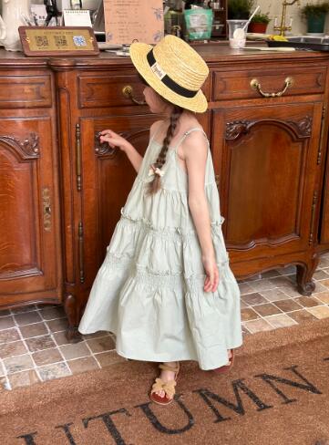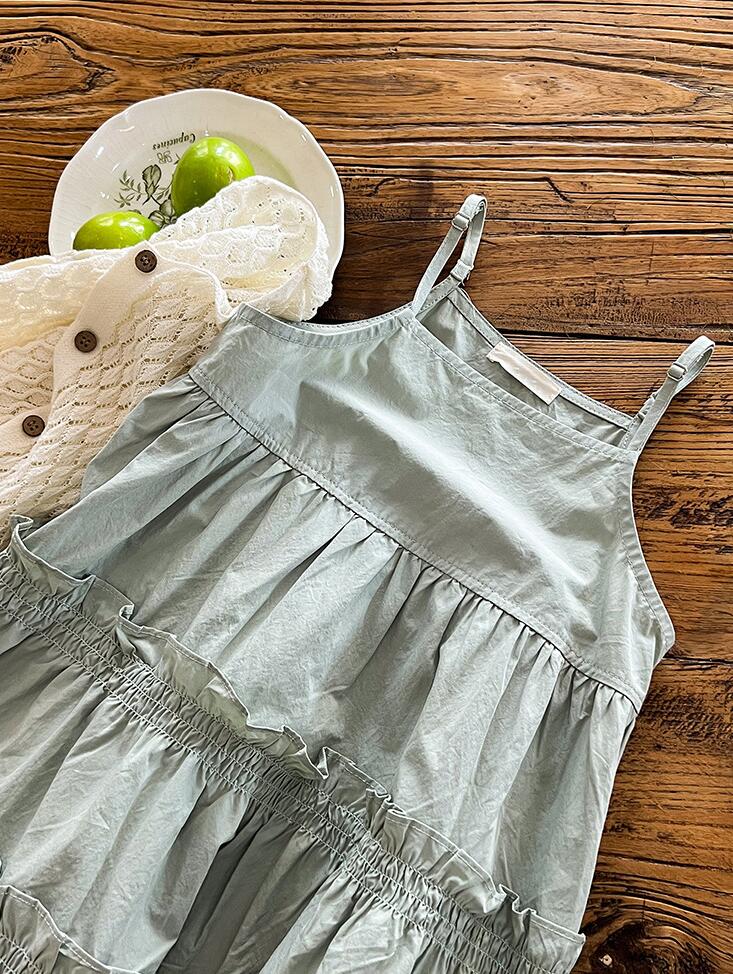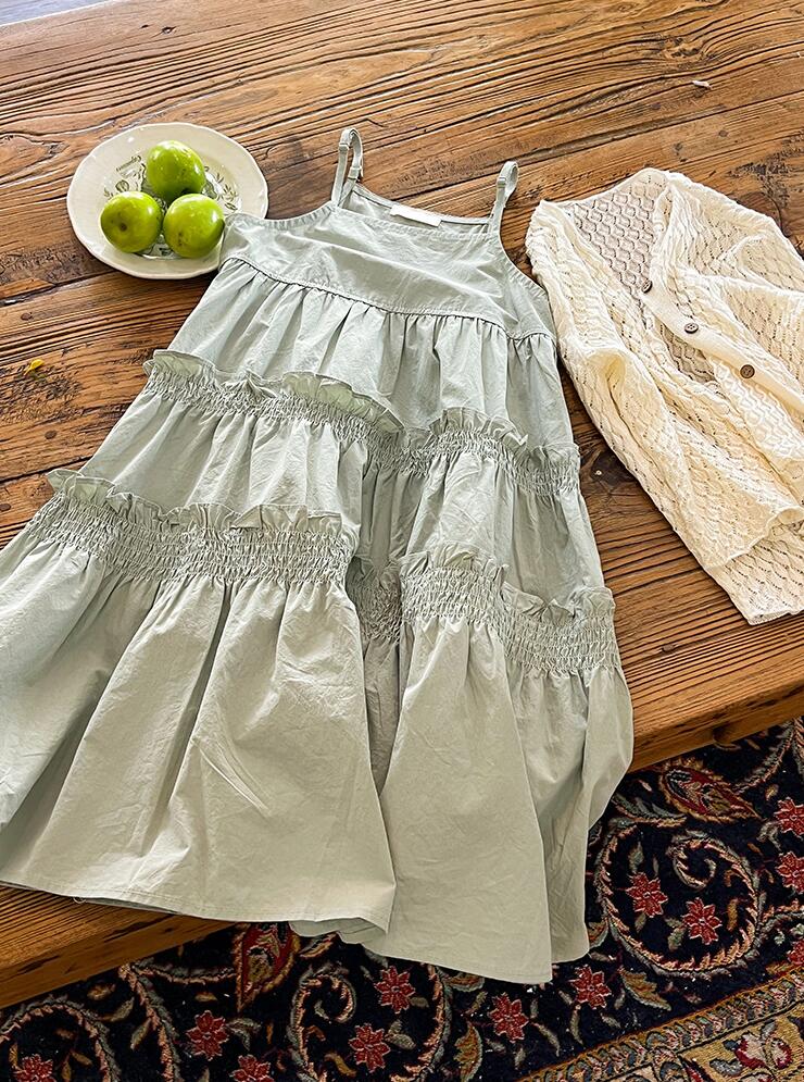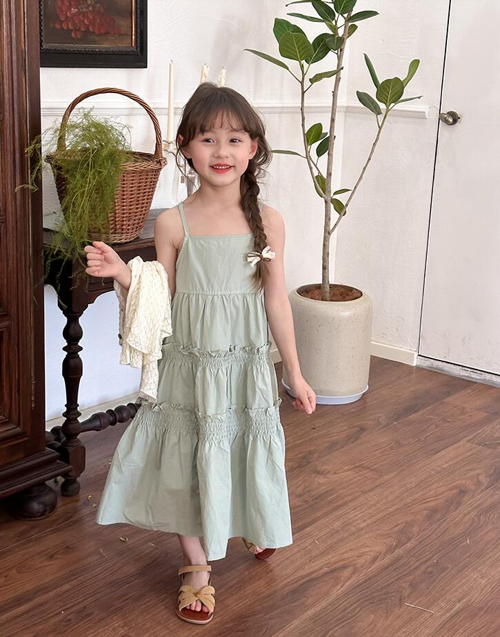 段々に重なったフリルが可愛らしく、ロングワンピースの優雅な印象を演出します。