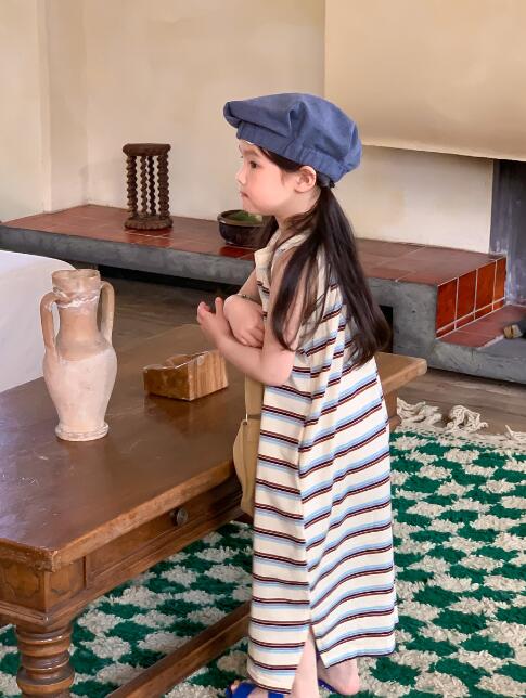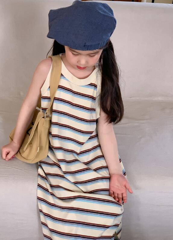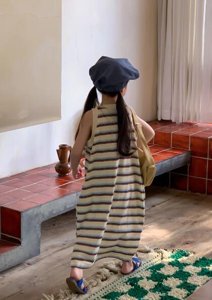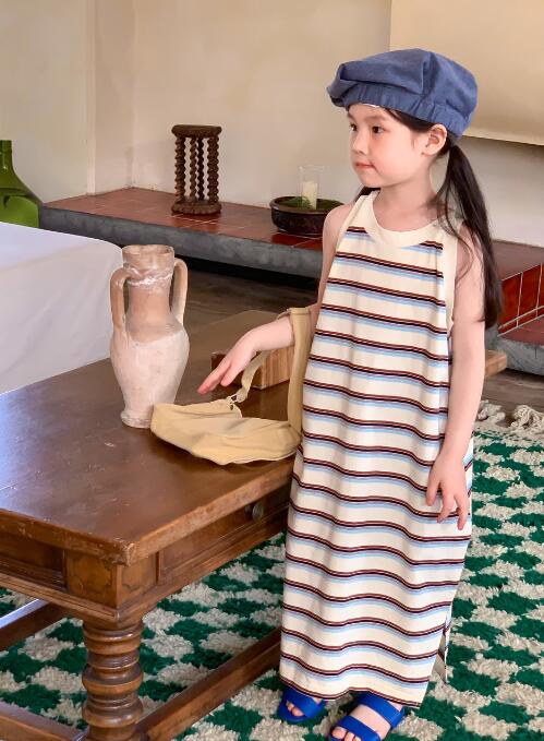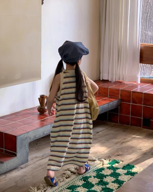 カラフルなマルチボーダー柄が可愛いキッズ用ノースリーブワンピースです。