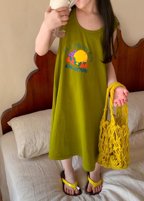 鮮やかなオリーブ色で可愛いプリントが胸元にデザインされており、お子様の魅力を引き立てます。