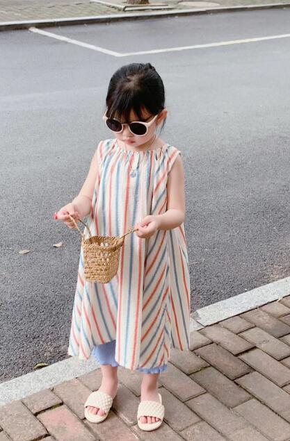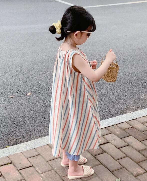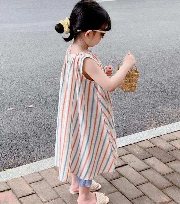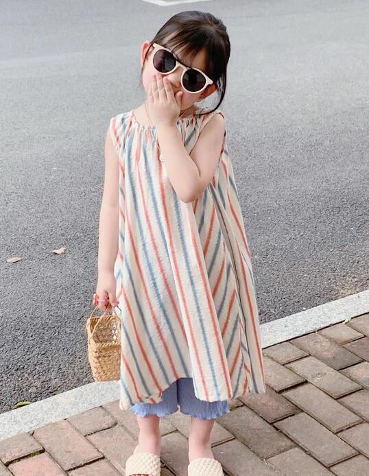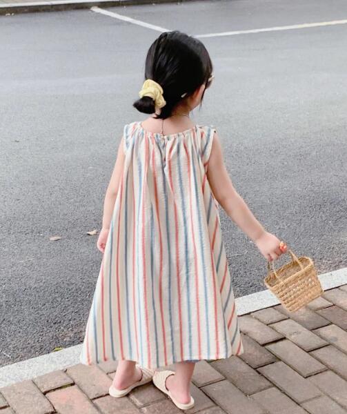 可愛らしい縦縞模様が特徴的なキッズ用ノースリーブロングワンピースです。