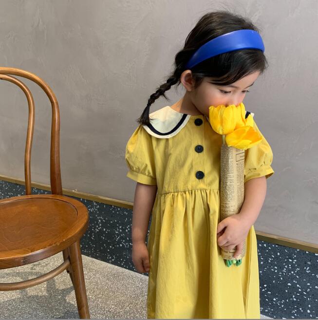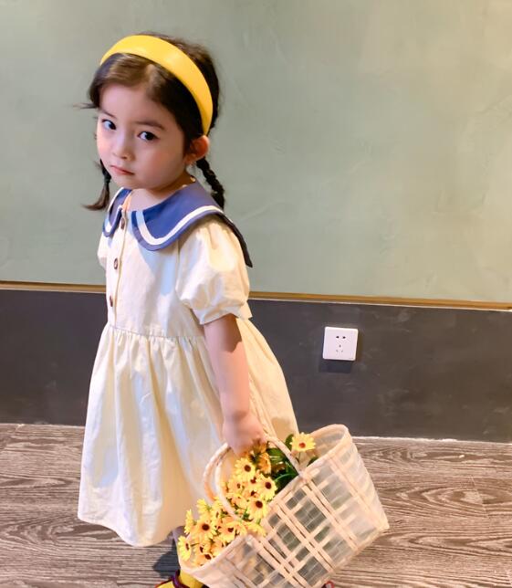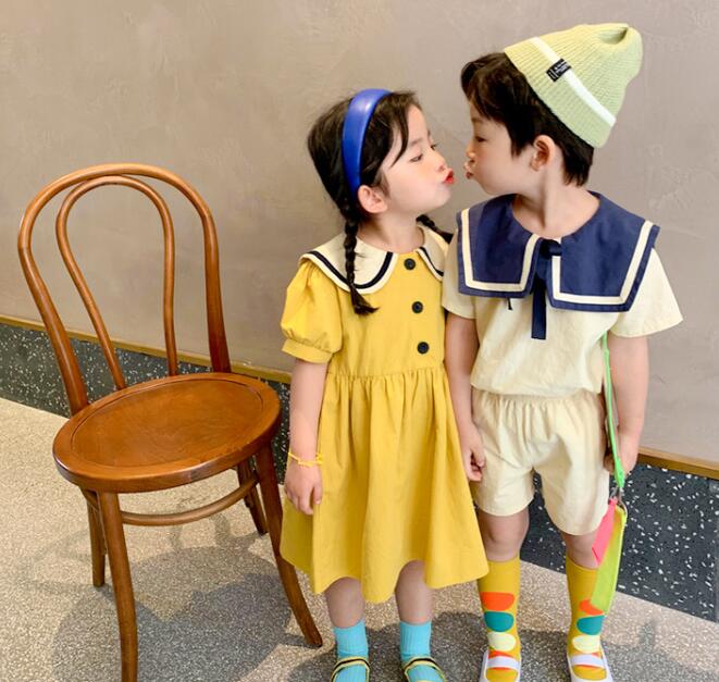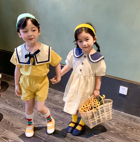 女の子用は黄色のロングワンピース、男の子用は紺と白の上下セットで兄妹コーディネートが楽しめます。