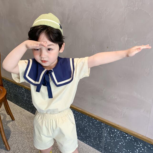 レトロで上品な襟元とボタンデザインが特徴的な子供服セットアップです。