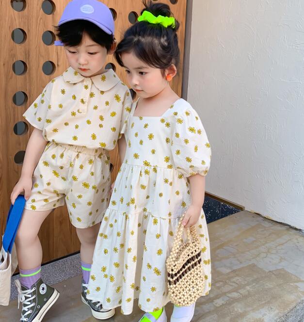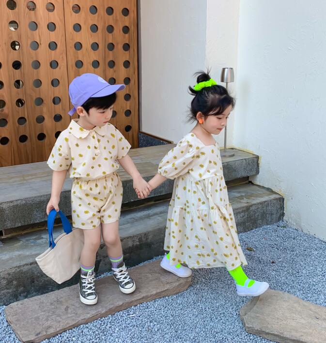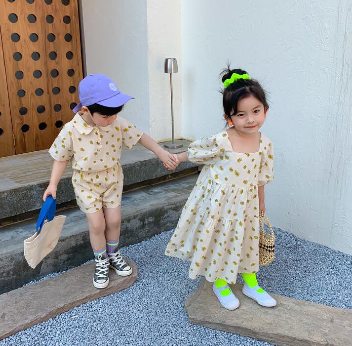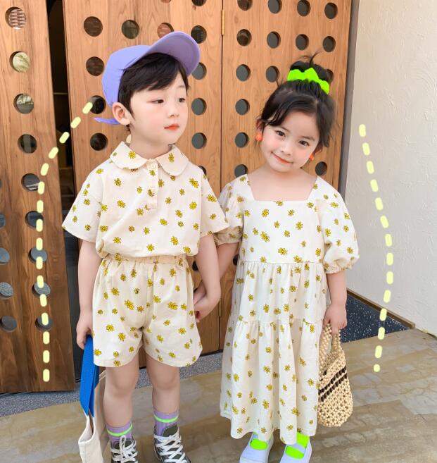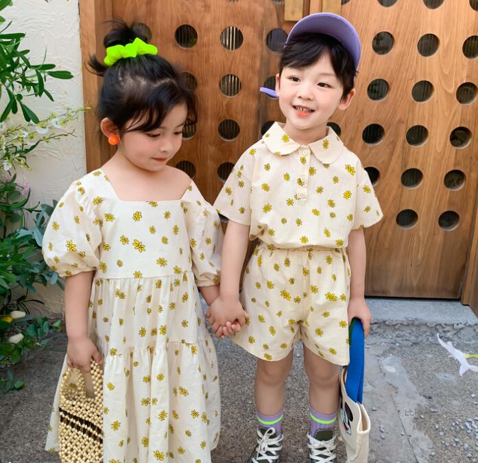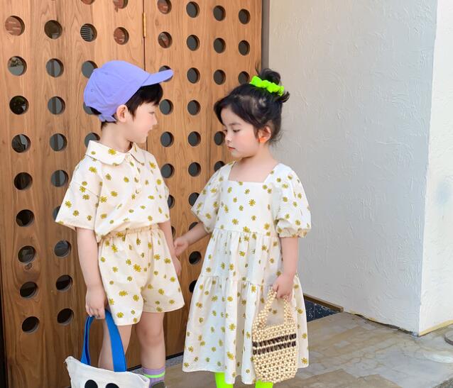 男の子用は半袖シャツとショートパンツ、女の子用はロングワンピースの組み合わせで兄妹コーディネートが楽しめます。