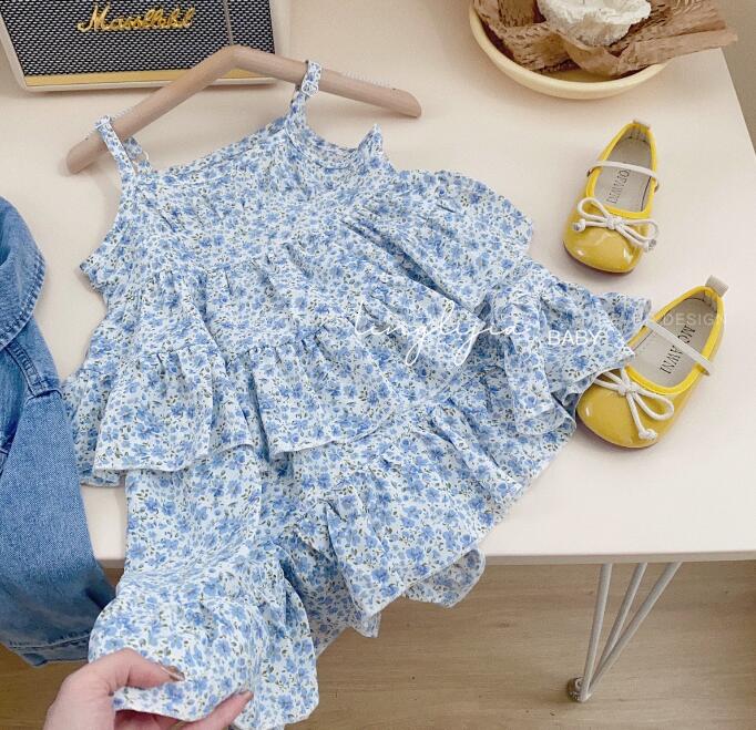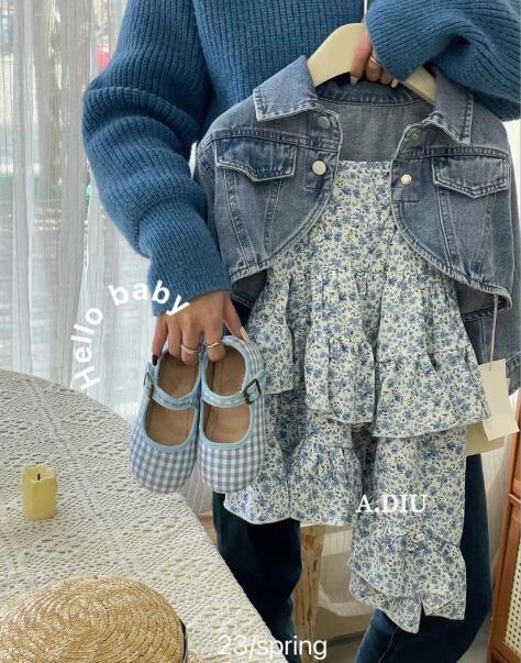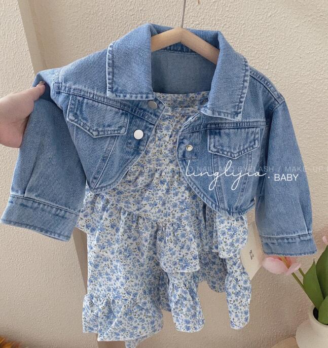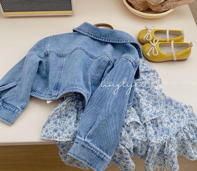 上品な花柄プリントが女の子らしさを演出し、デニムジャケットでカジュアルにも着こなせます。