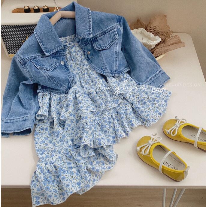 可愛い花柄のロングワンピースとデニムジャケットのキッズ向け二点セットです。