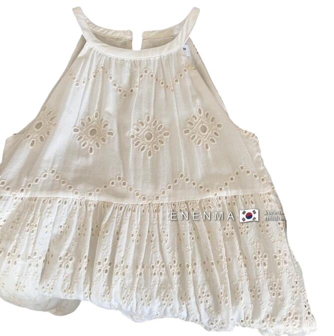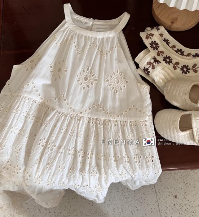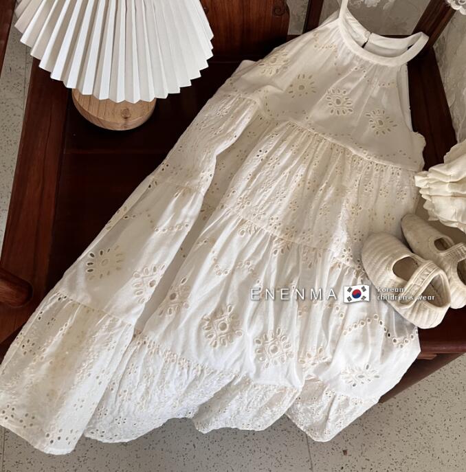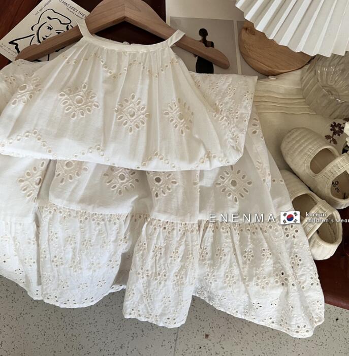 上品な白色レースと美しい刺繍が特徴的なキッズ用ロングワンピースです。