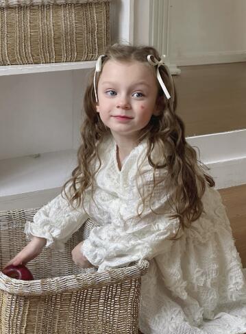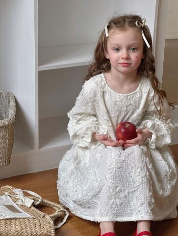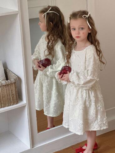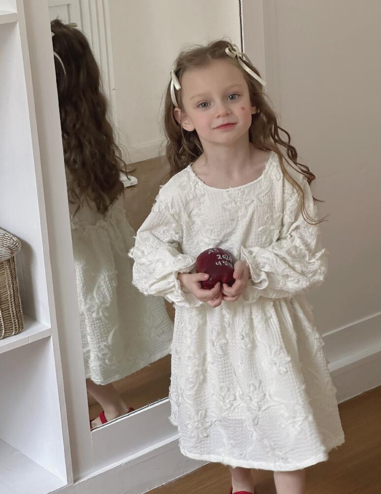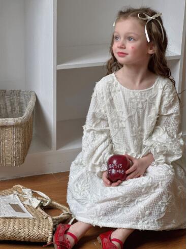 上品な白いレース素材で仕立てたキッズ用ロングワンピースです。 長袖デザインで季節問わず着回しができ、女の子らしい優雅なシルエットが魅力的。 特別な日のおめかしから普段使いまで幅広くお使いいただけます。