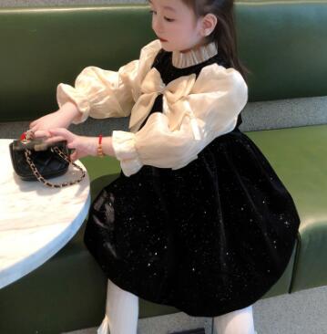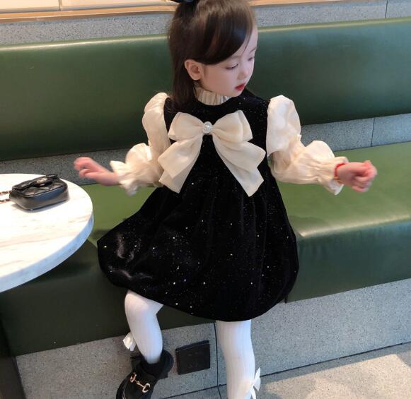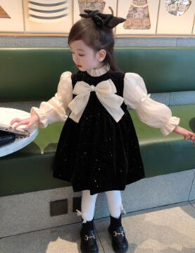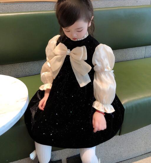 白いブラウスと黒いベルベット風スカートの組み合わせがとても可愛らしく、発表会や結婚式などの特別な日にぴったりです。