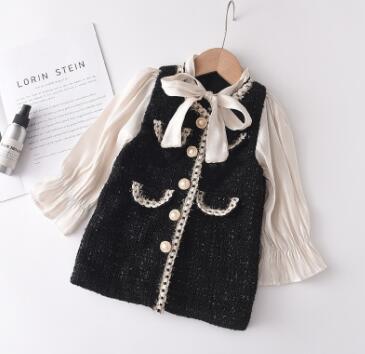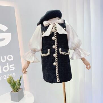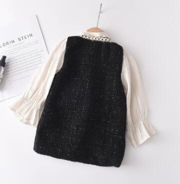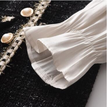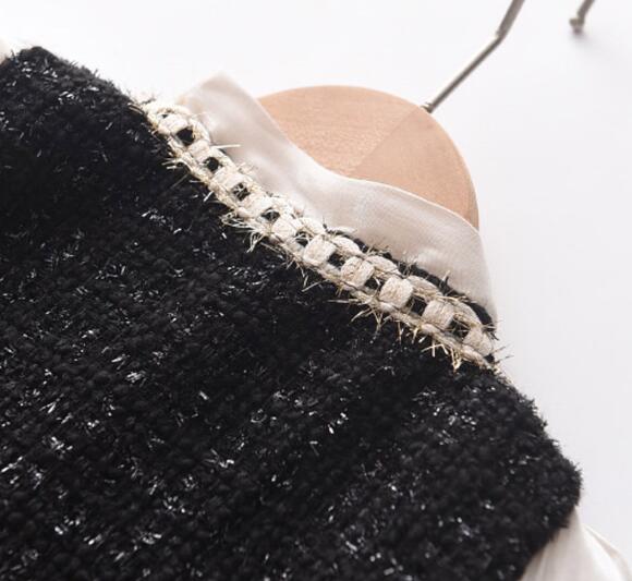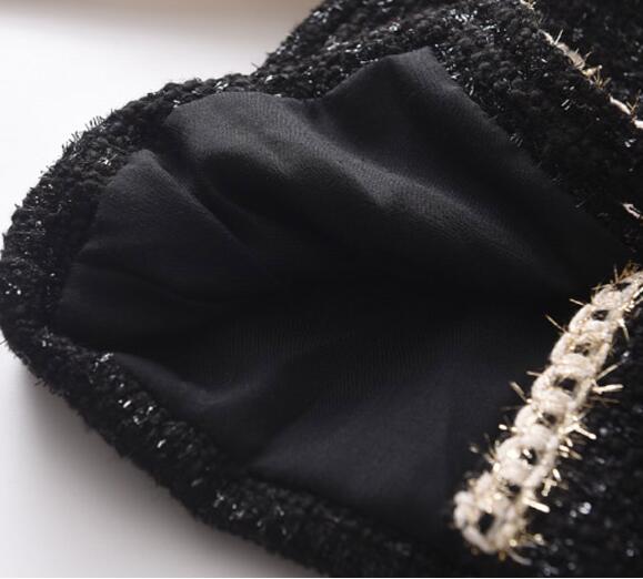 黒のツイード風生地に白いリボンとパール調ボタンが華やかさを演出します。