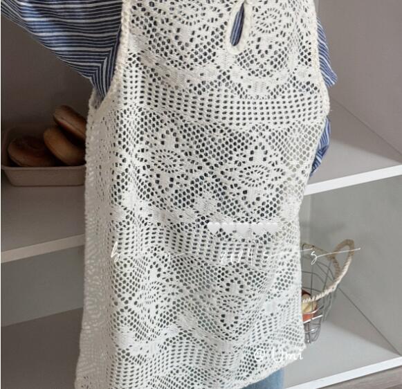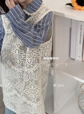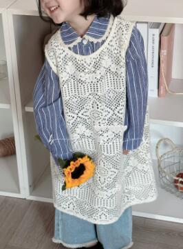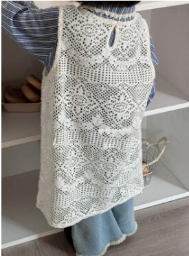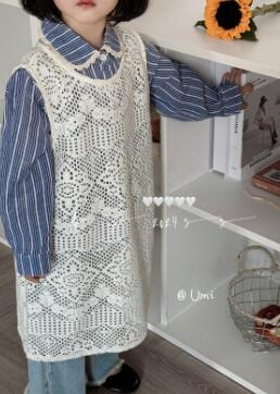 青い縞模様の長袖シャツと白いレース編みのロングワンピースの組み合わせで、