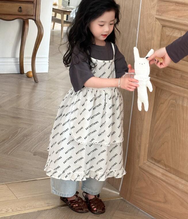 文字柄が可愛い白いロングワンピースと黒い長袖の組み合わせで、重ね着風のコーディネートが簡単に完成します。