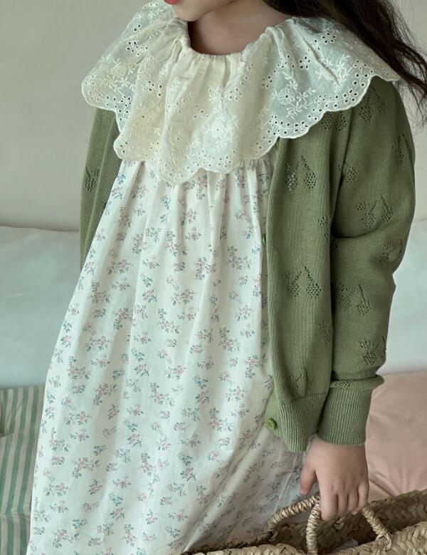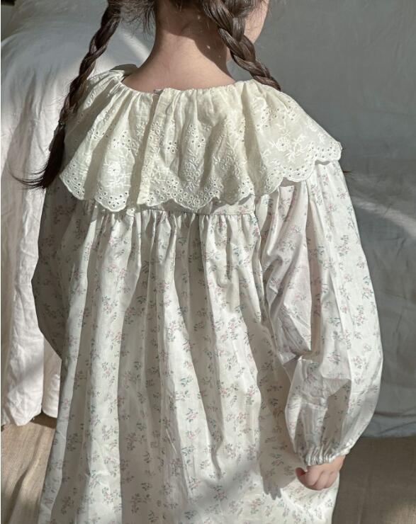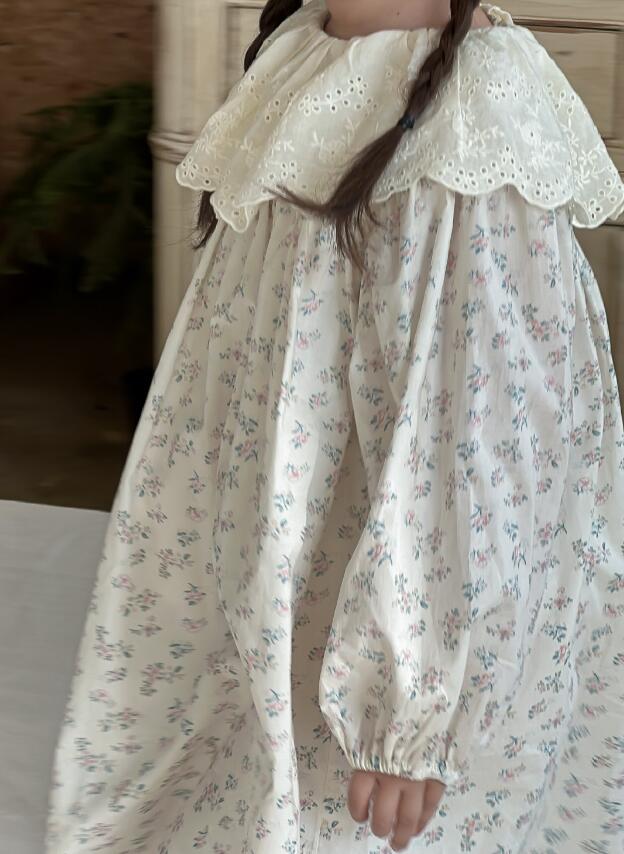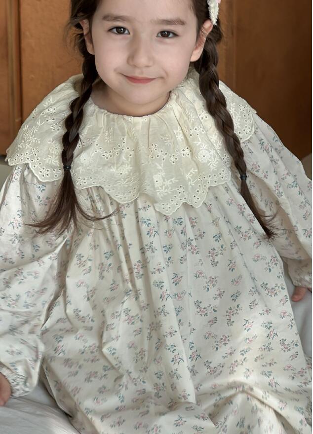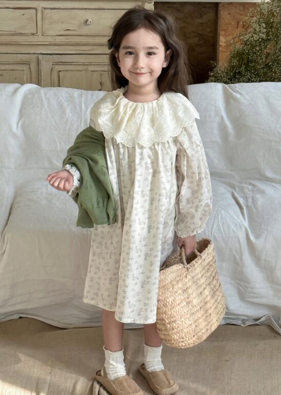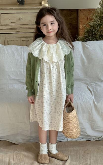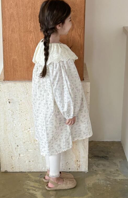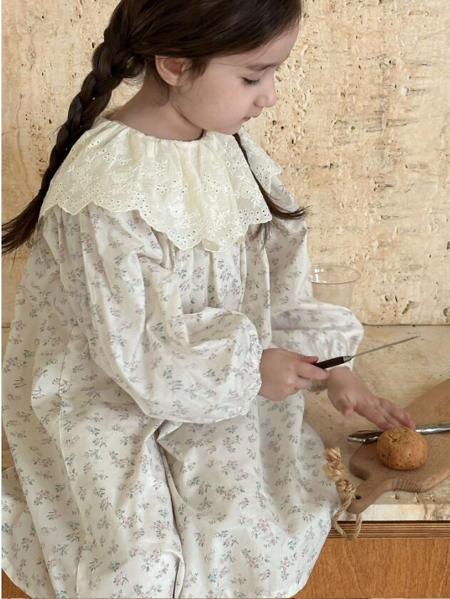 可愛らしい花柄が魅力的なキッズ用ロングワンピースです。 上品な襟フリルがお嬢様風の仕上がりを演出します。 90センチから150センチまでサイズ展開豊富で長くお使いいただけます。 お出かけや普段使いにもぴったりの一枚です。