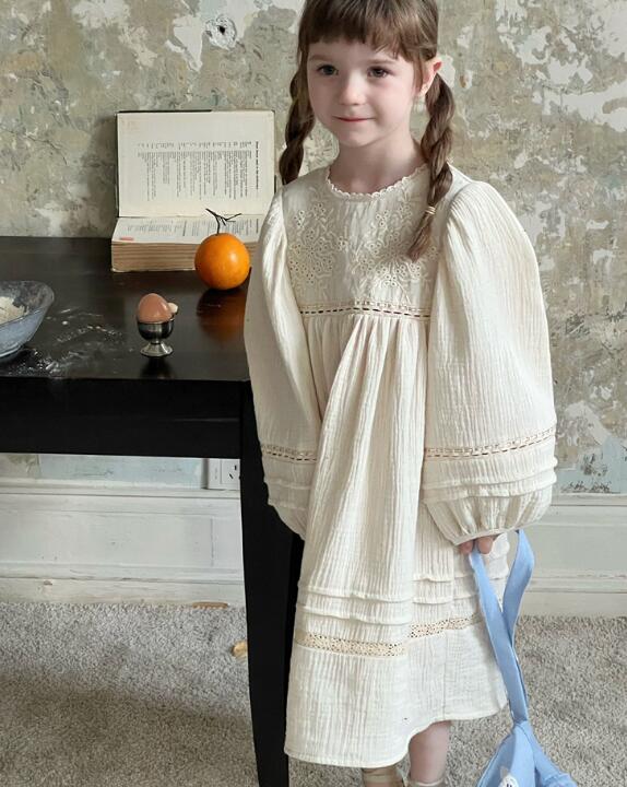 上品なレース刺繍が美しいキッズ用ロングワンピース。 柔らかなコットン素材で着心地抜群、パフスリーブがとても可愛らしいデザインです。 お出かけや特別な日にぴったりの一枚で、90センチから150センチまで豊富なサイズ展開。