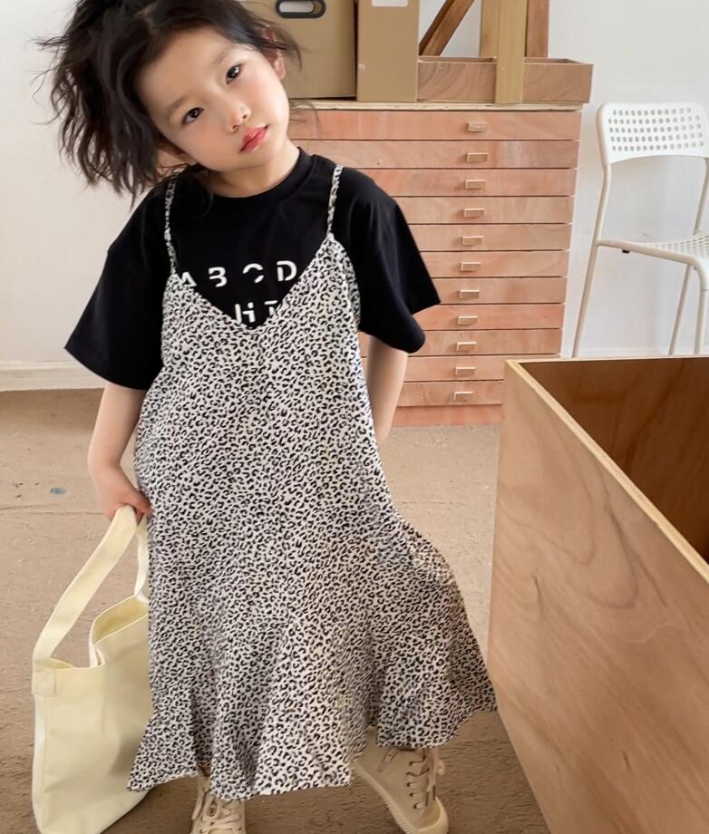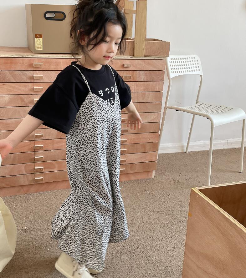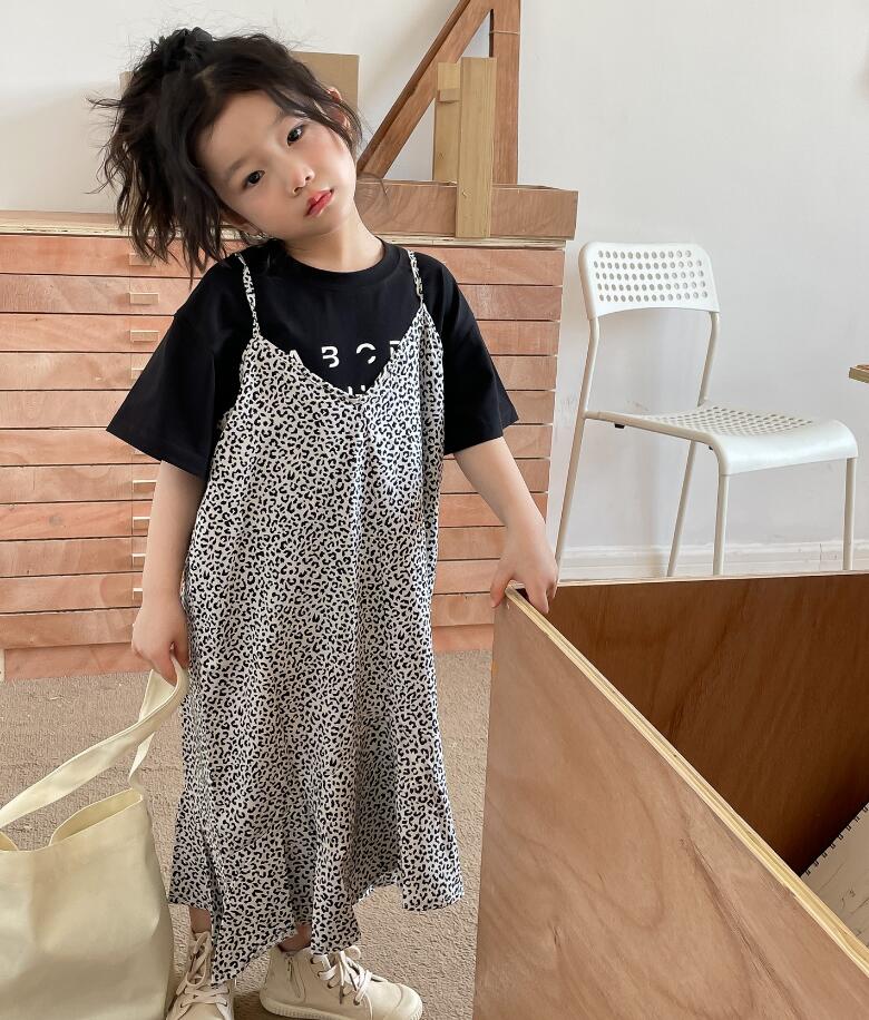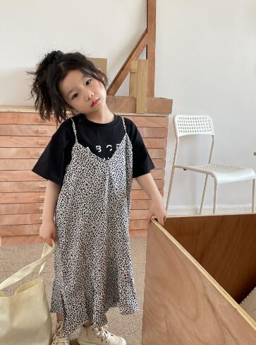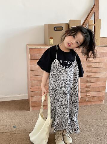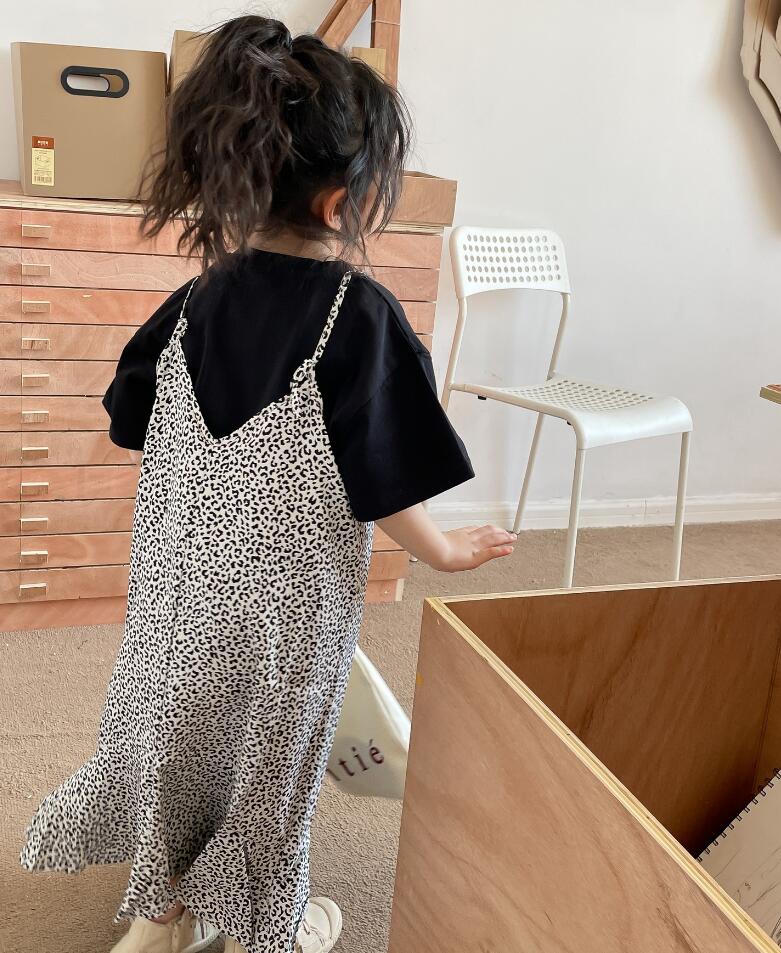 2024年春夏の新作キッズファッション。 黒いTシャツと小花柄のキャミソールワンピースの2点セット。 ロングワンピースはゆったりとした着心地で、普段使いから特別な日まで活躍。 サイズ:80〜130センチ対応
