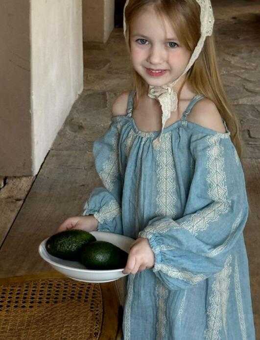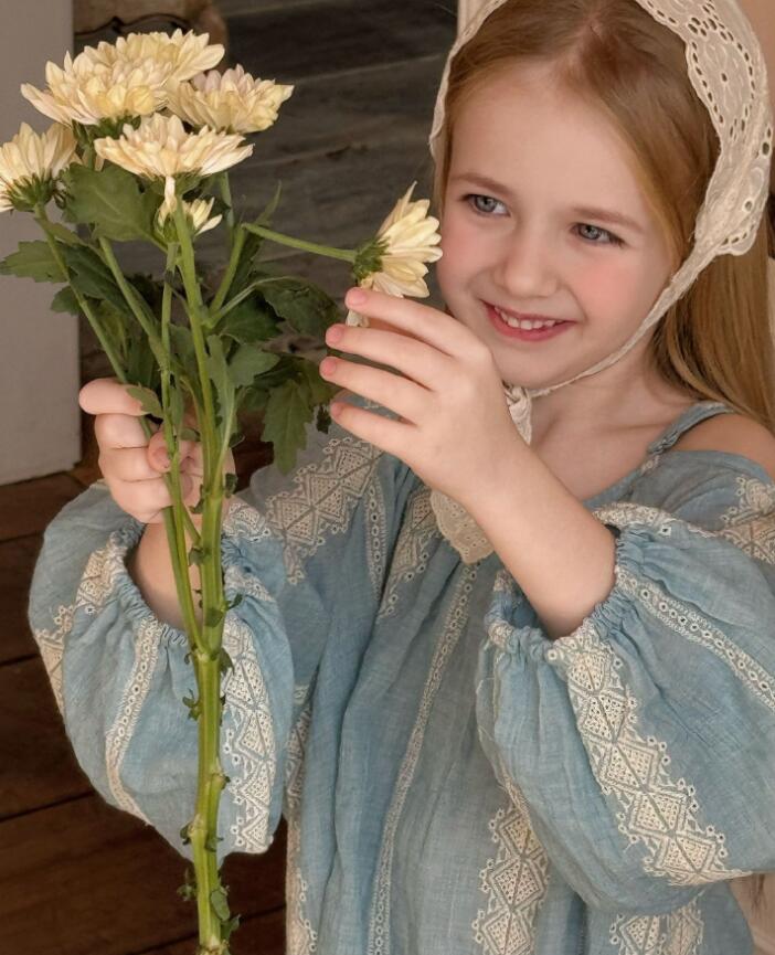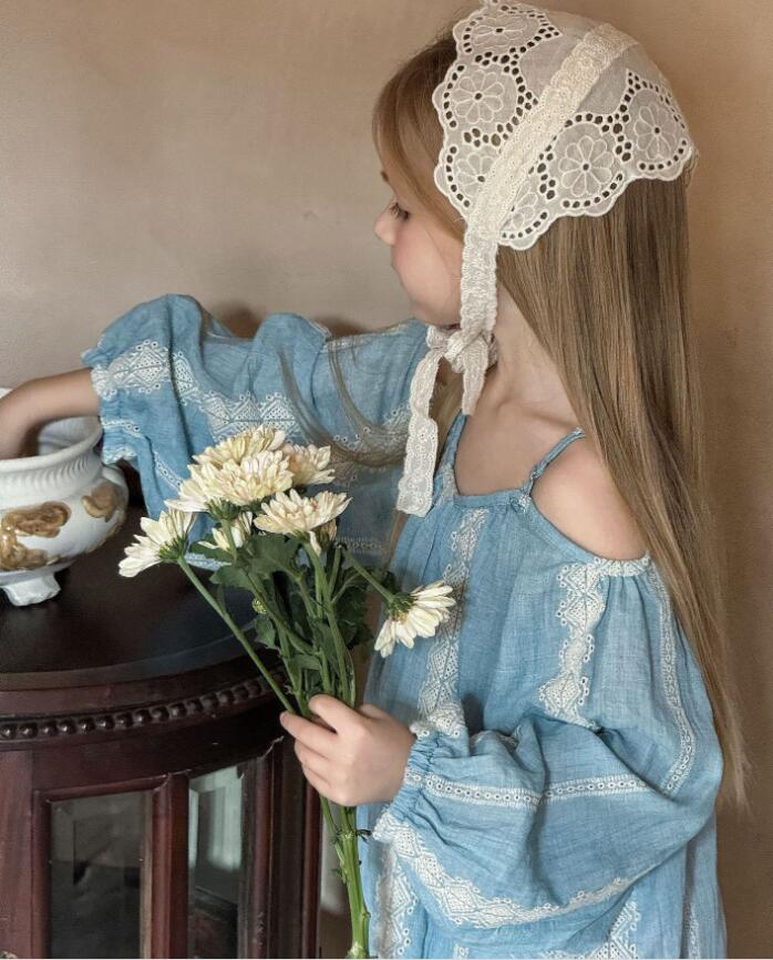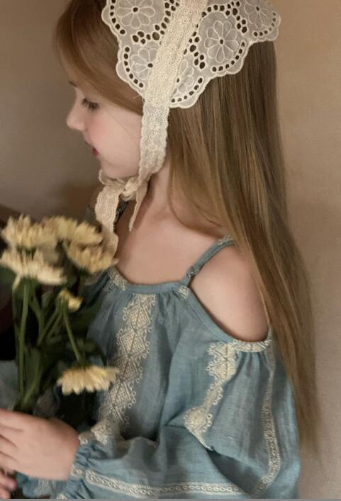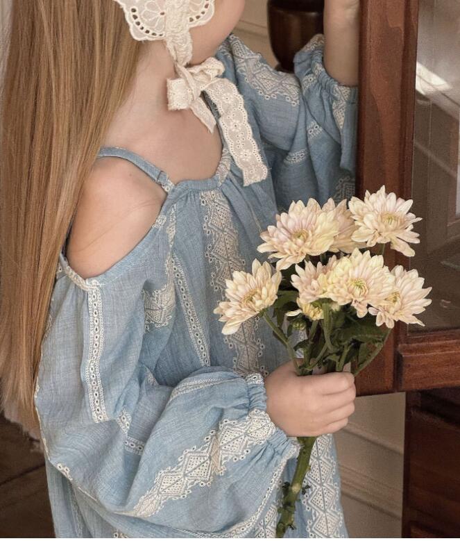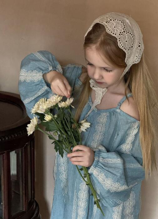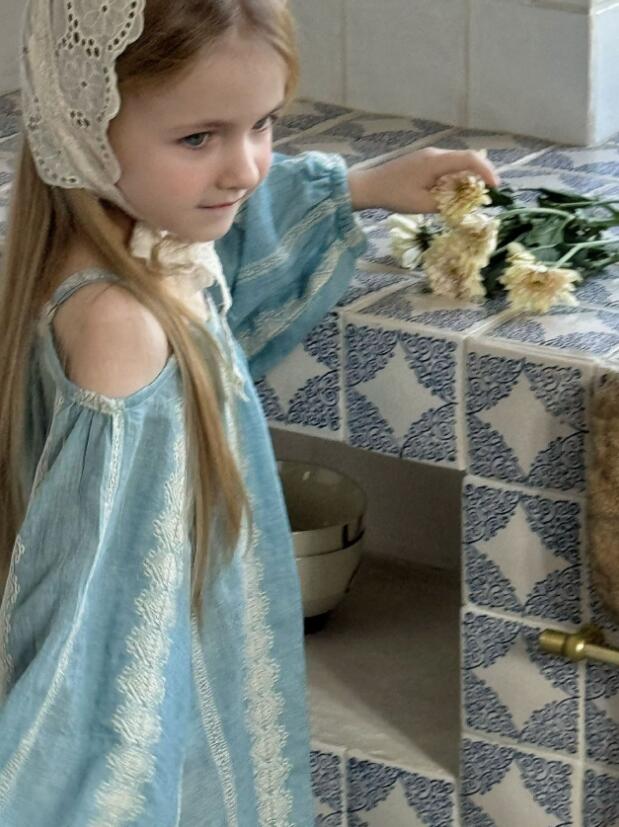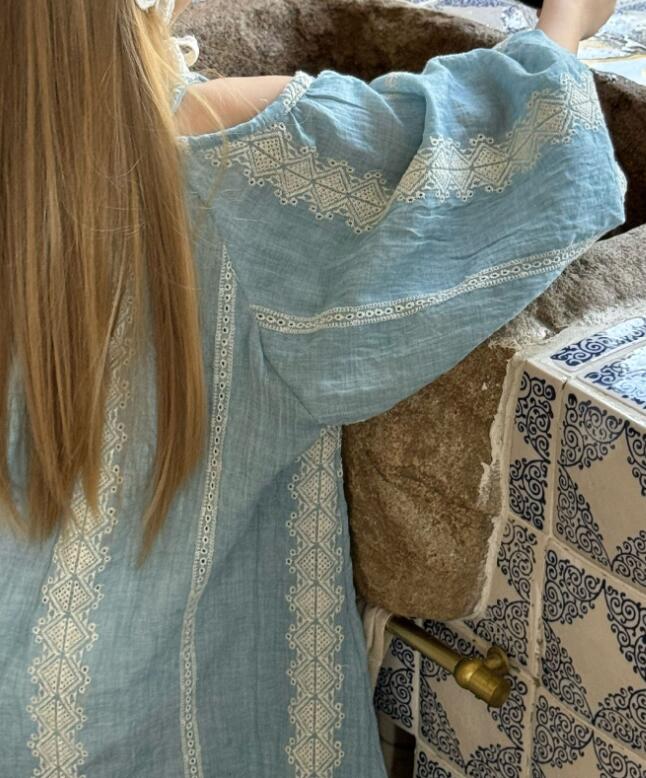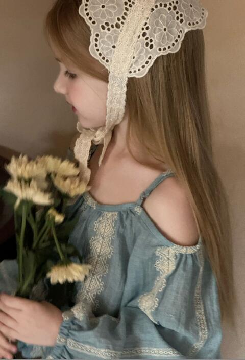 上品なレース刺繍が施された淡い水色の生地で、特別な日にもデイリーにも活躍します。