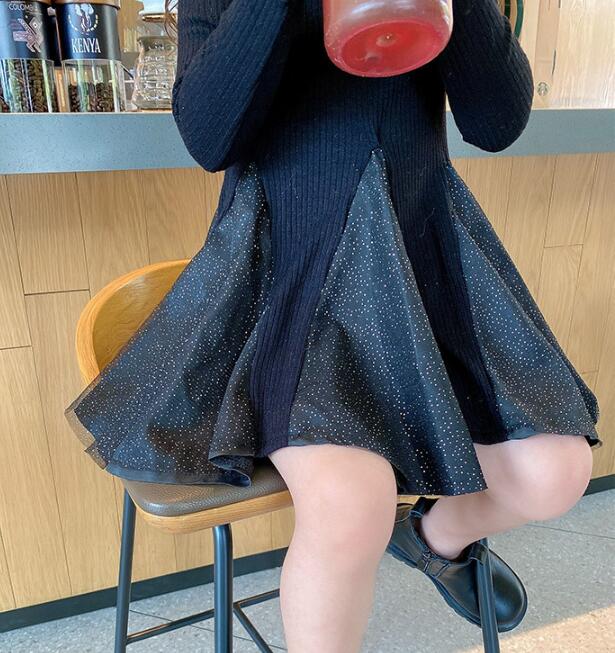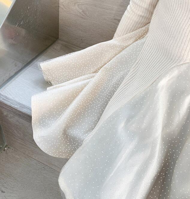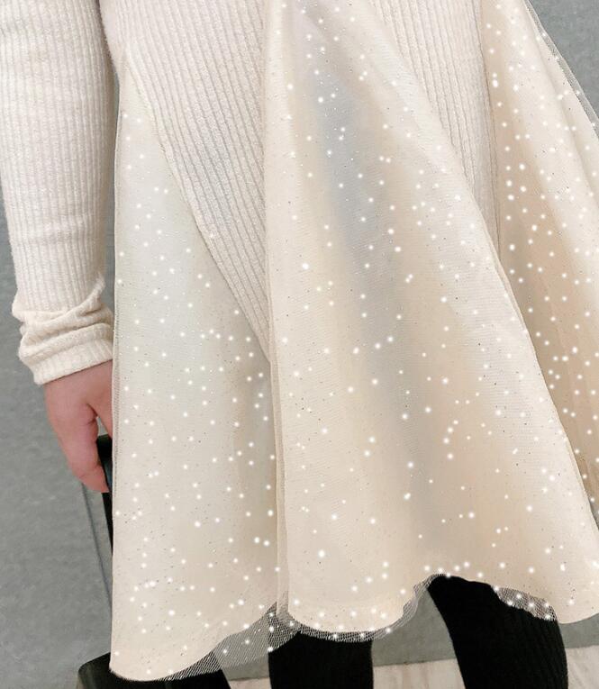 上品なニット素材と星柄スカートの組み合わせが可愛らしさを演出します。