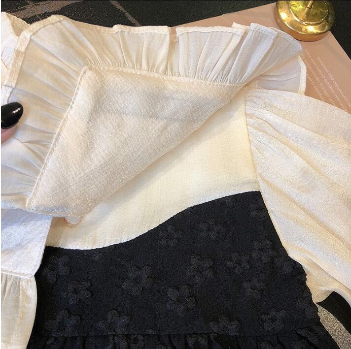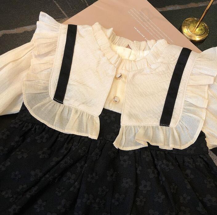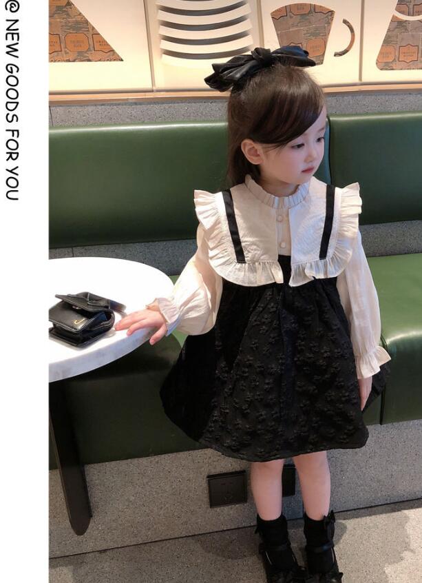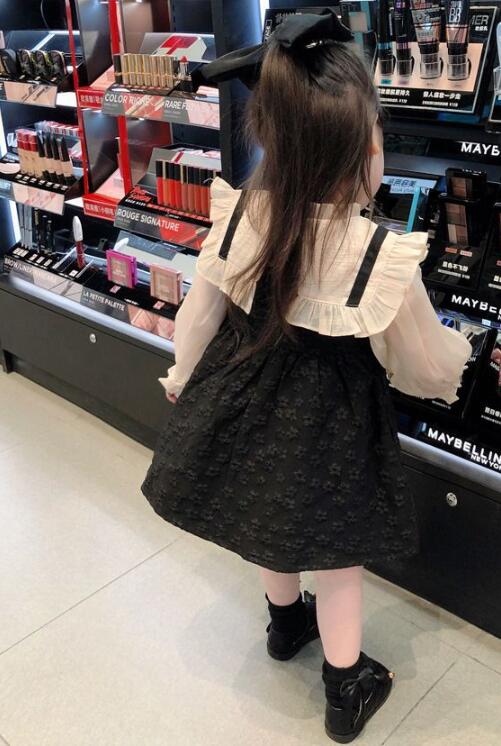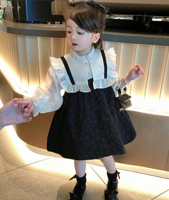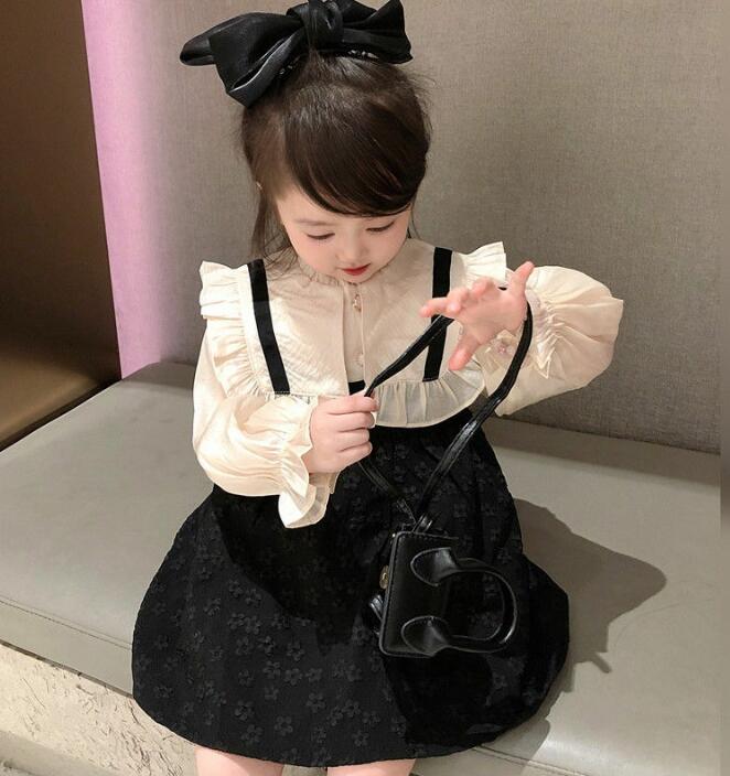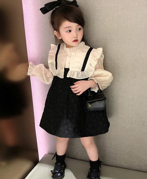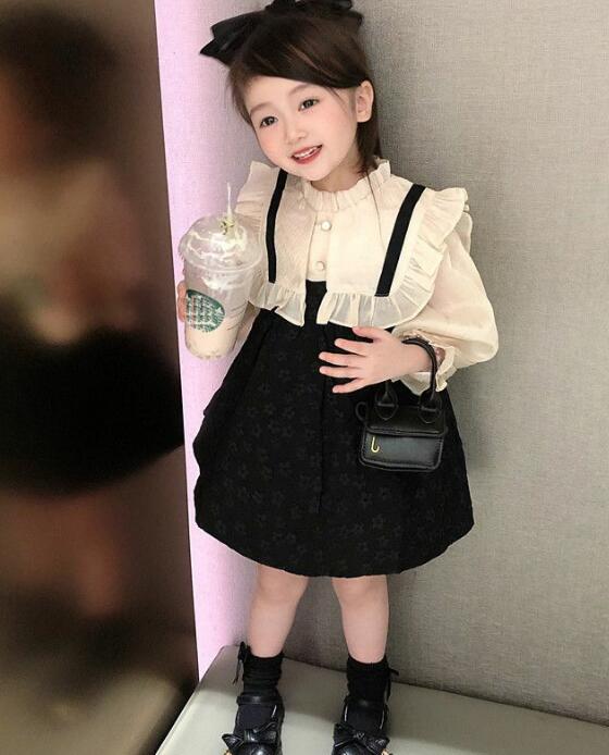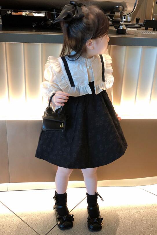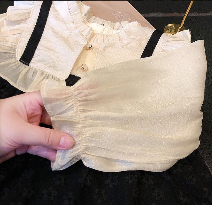 上品なフリル袖ブラウスと黒のサロペットスカートがセットになった、キッズ用の可愛らしいワンピースです。