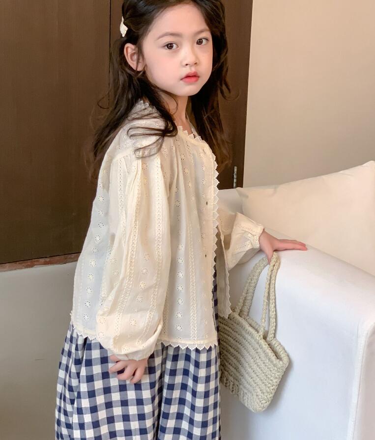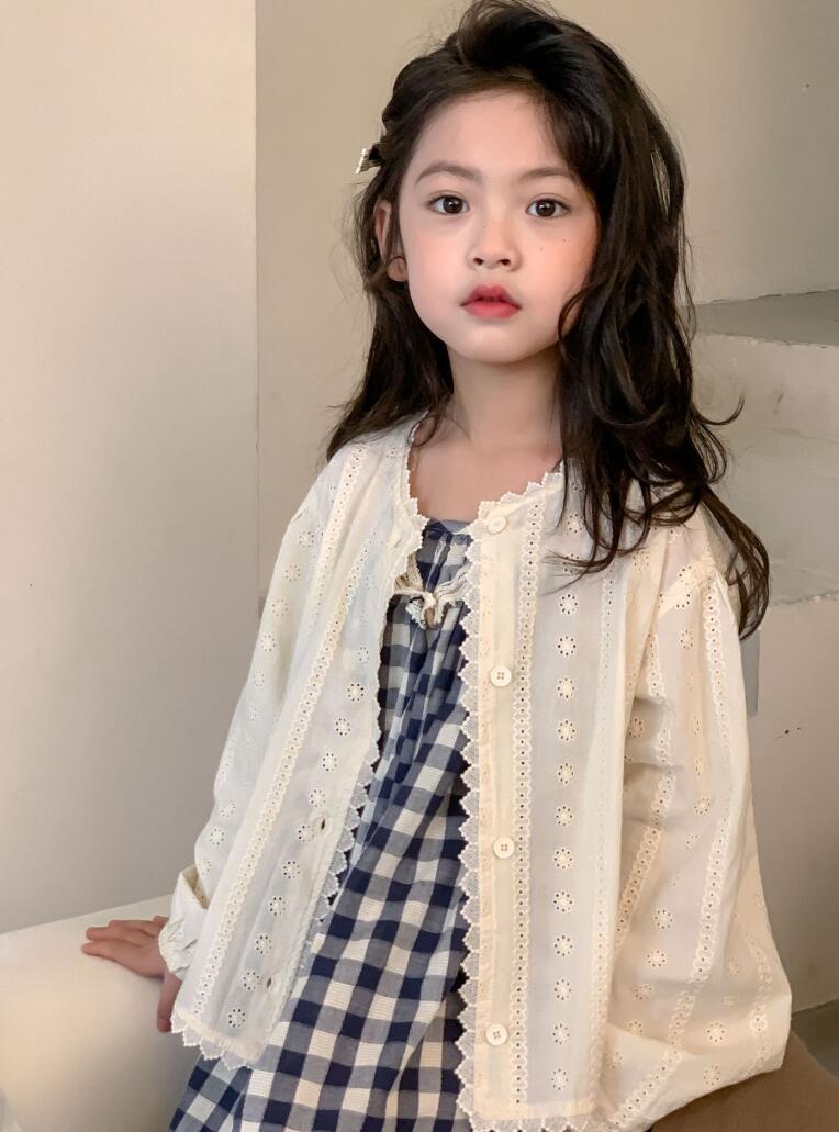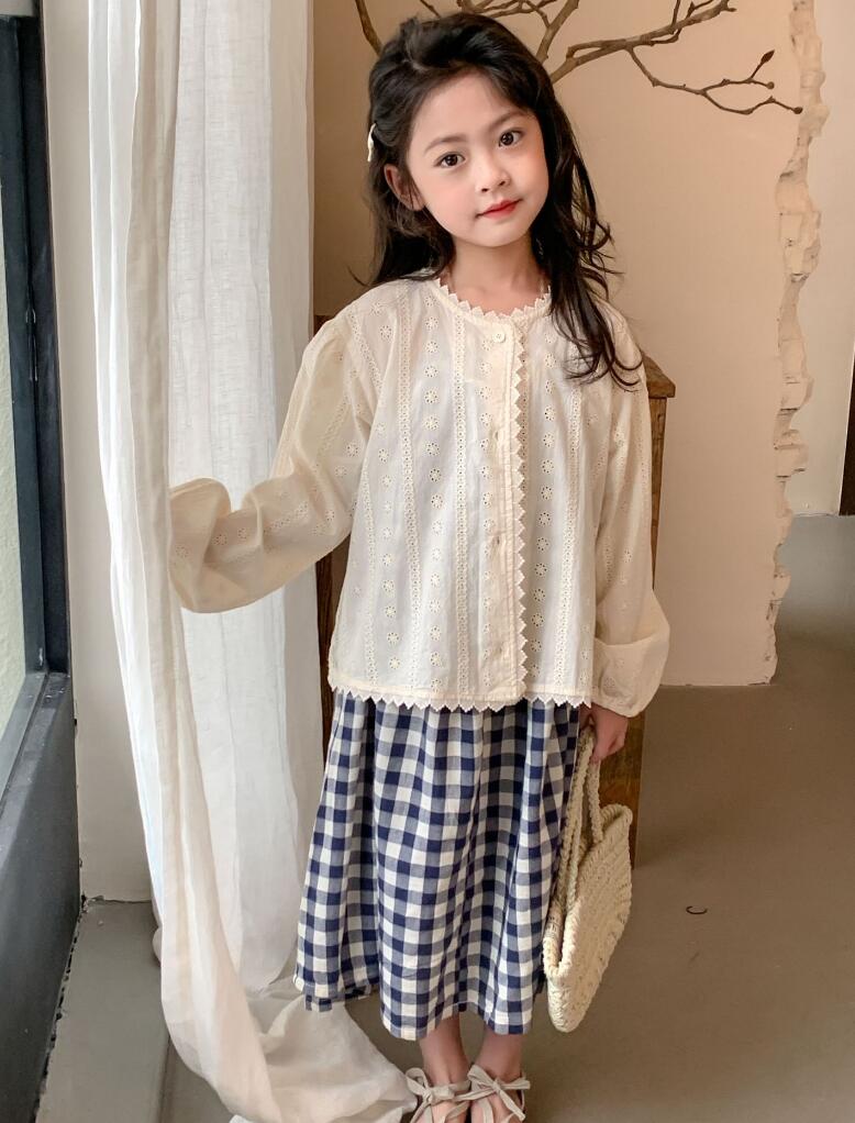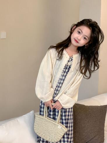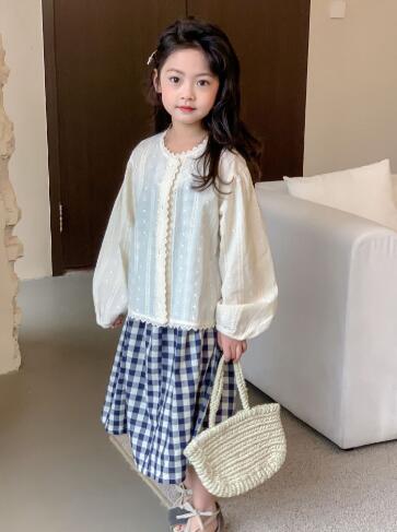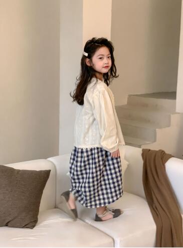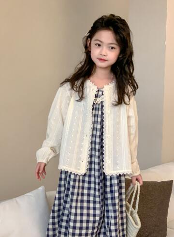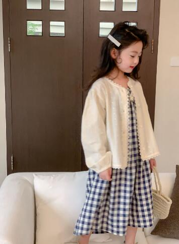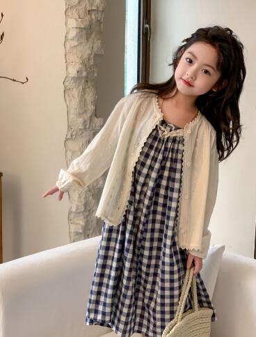 上品なチェック柄のロングワンピースと白いレースカーディガンの組み合わせで、お出かけや特別な日にぴったり。