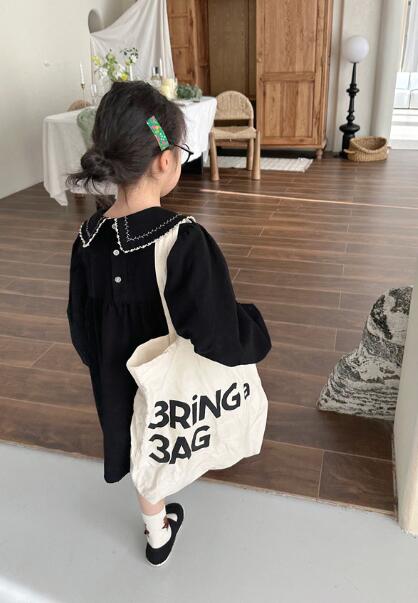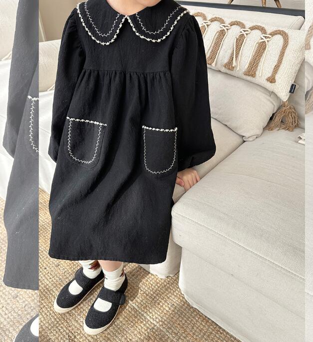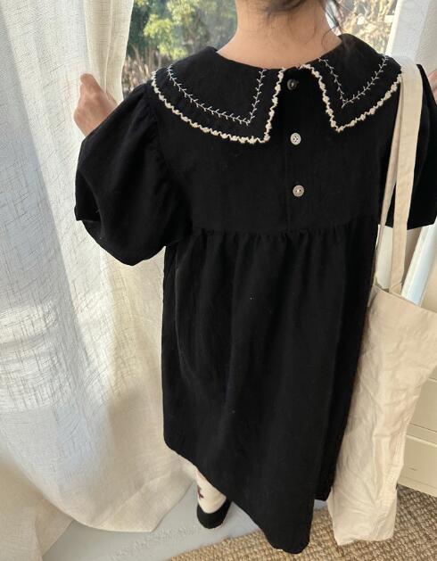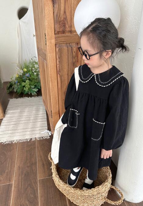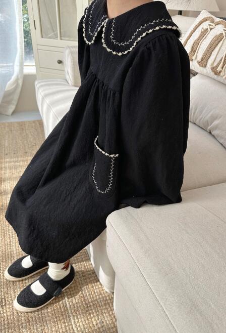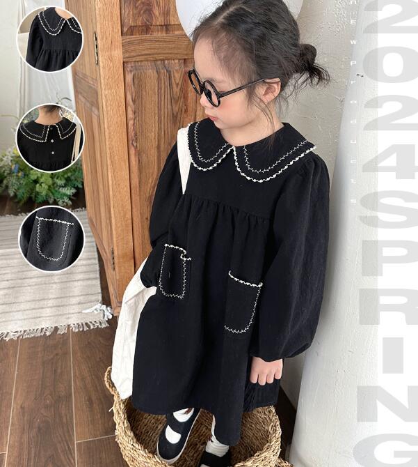 上品な丸襟デザインにパール風の白糸刺繍が施されたキッズ用ロングワンピースです。