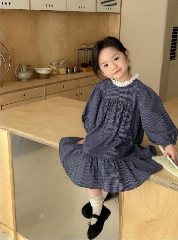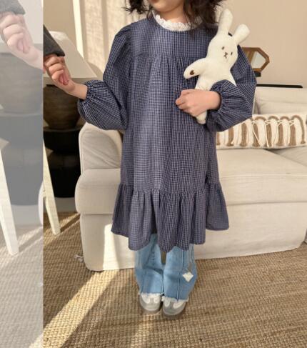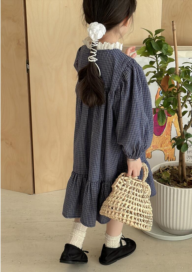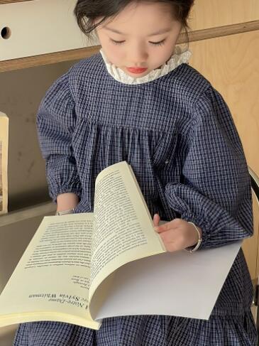 上品な白襟がアクセントのキッズ用ギンガムチェック柄ロングワンピース。
