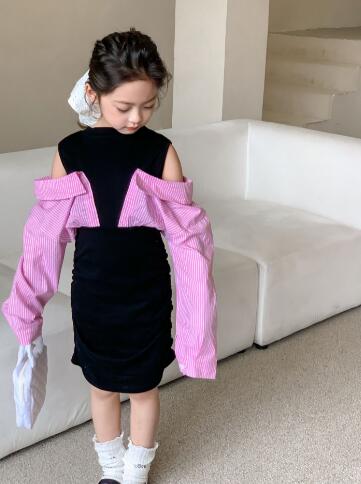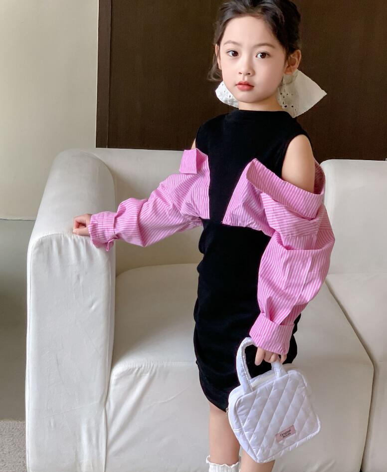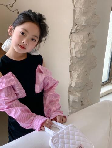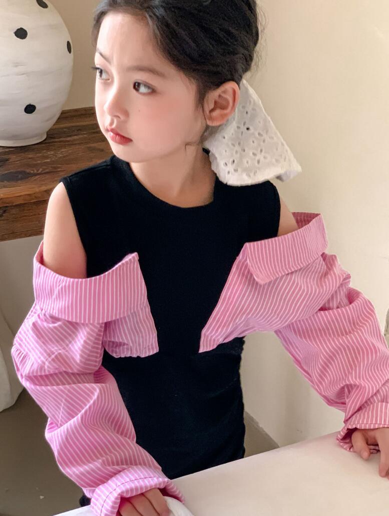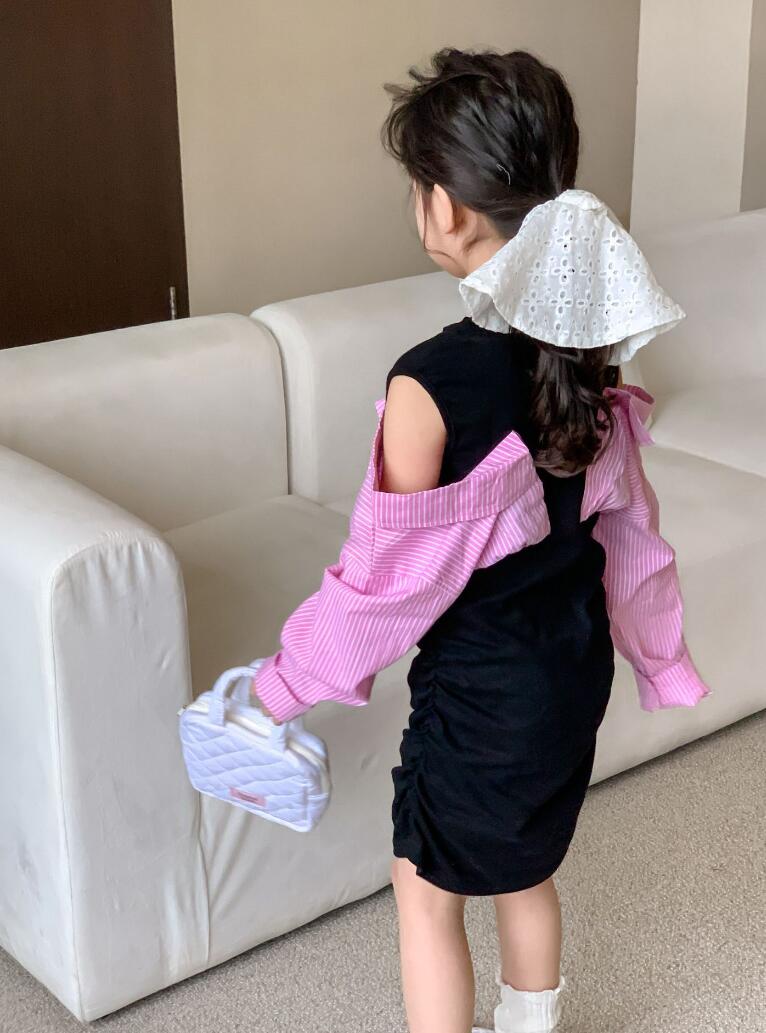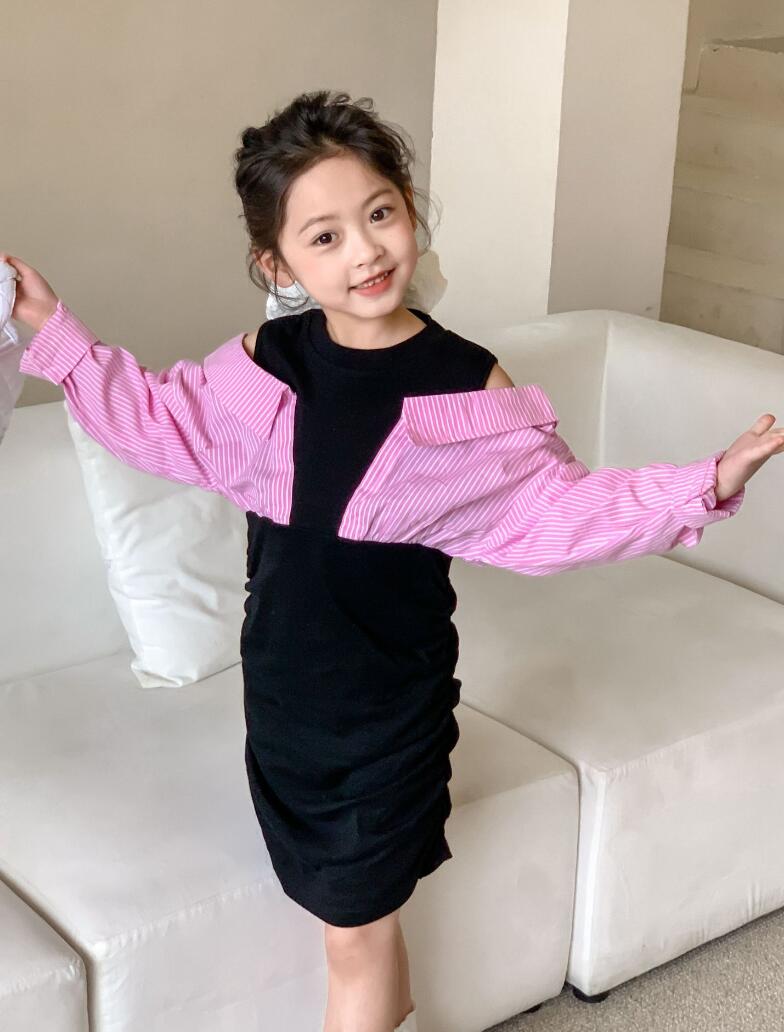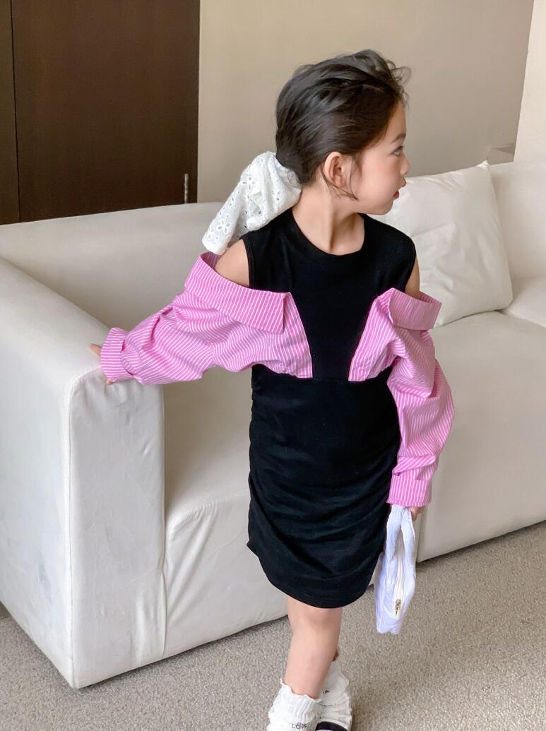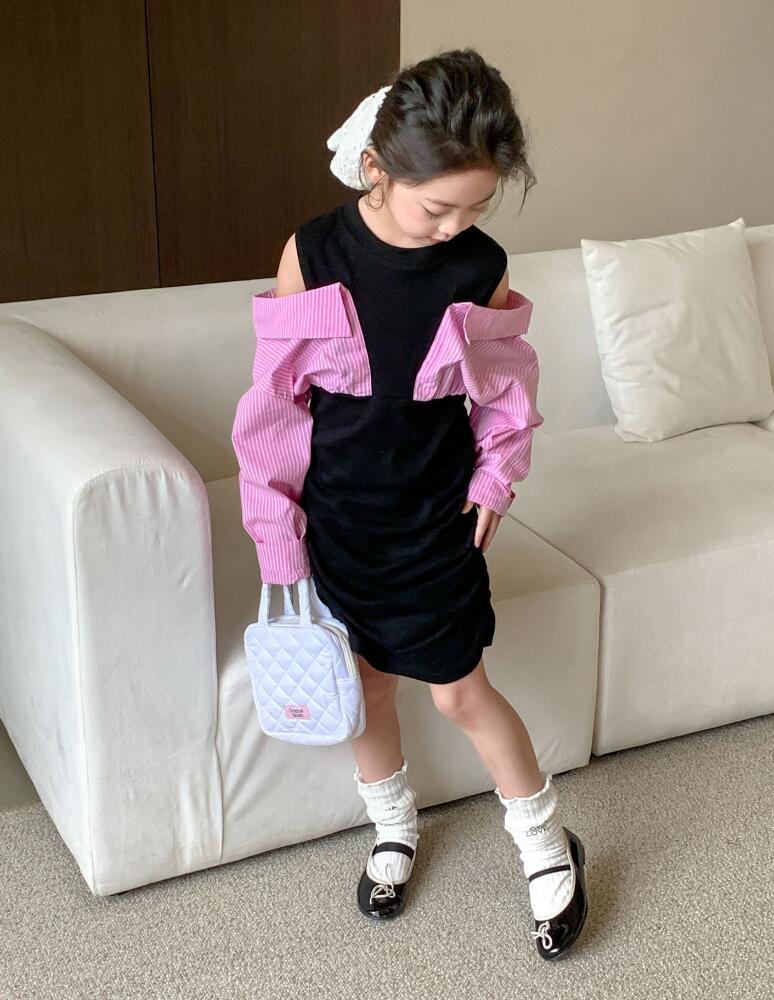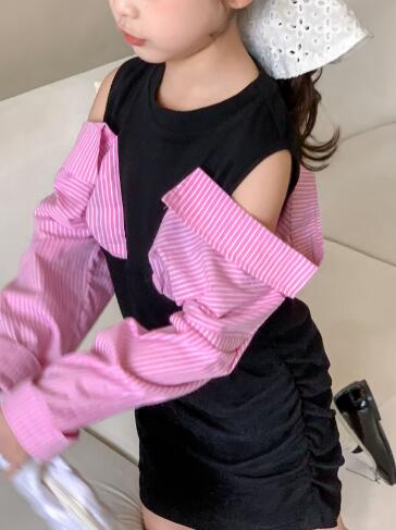 黒のボディ部分にピンクのストライプシャツを重ね着したような可愛らしいデザインです。
