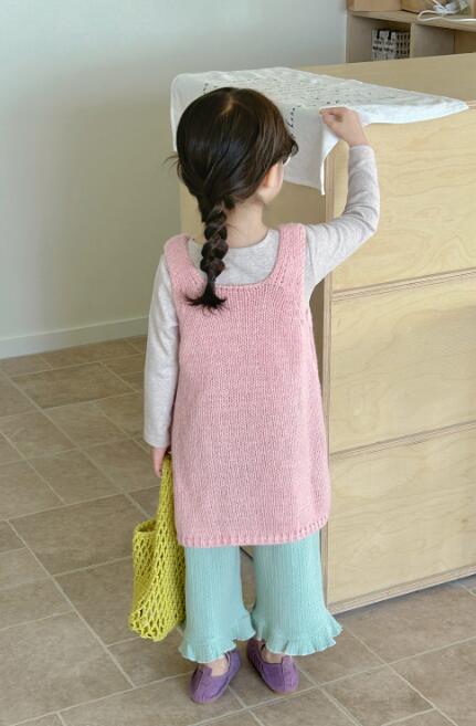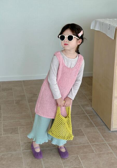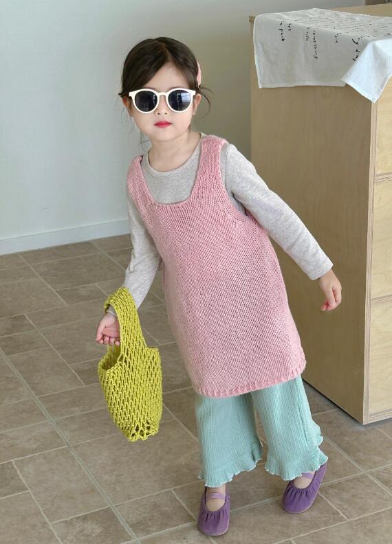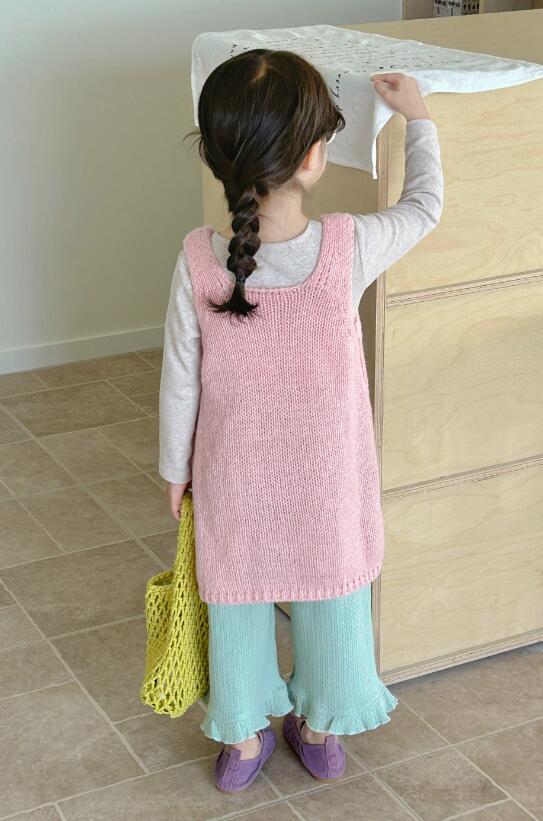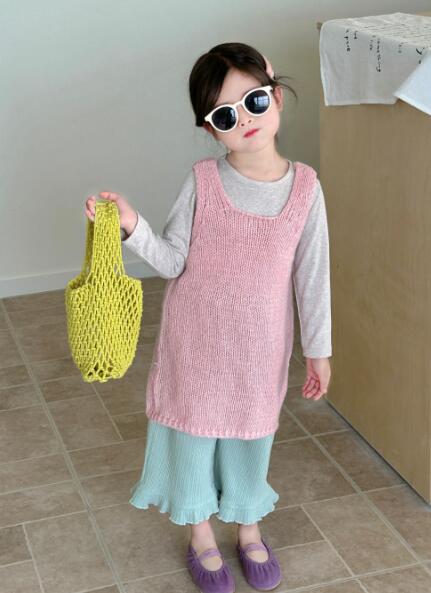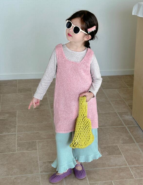 おしゃれなキッズ用ニットベストワンピースとロングパンツの可愛い3点セットです。