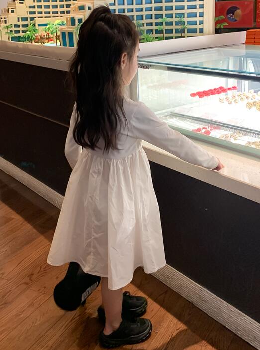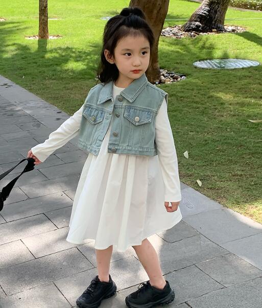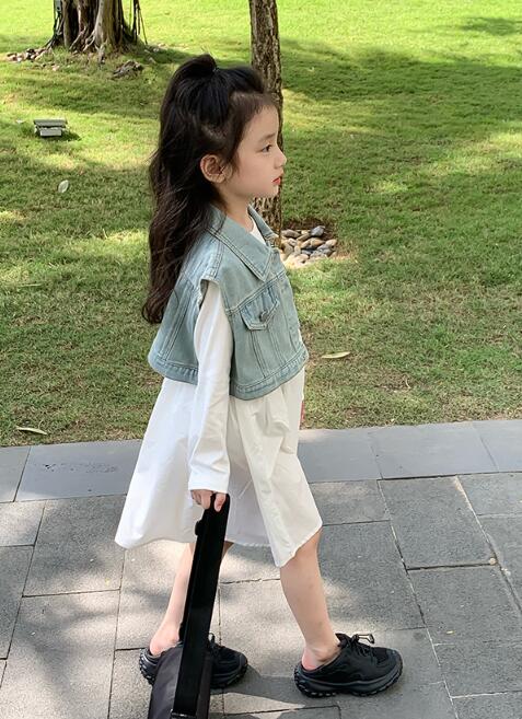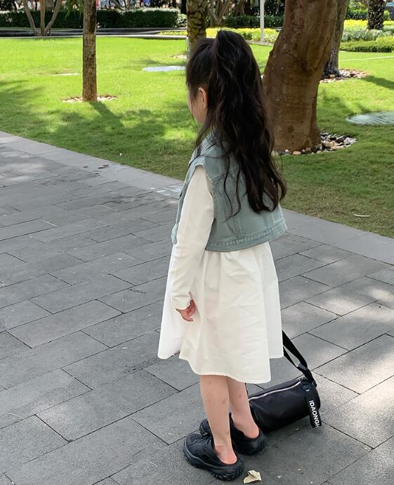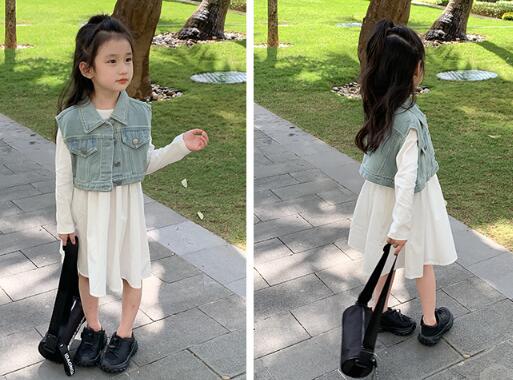 2024年新作のキッズ用ロングワンピースとデニムベストの二点セット。