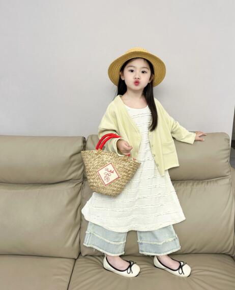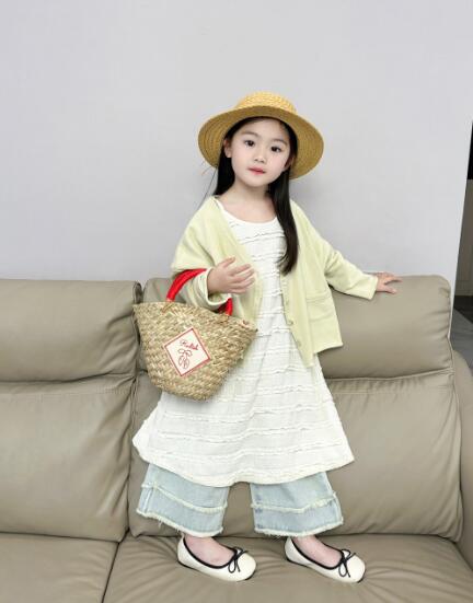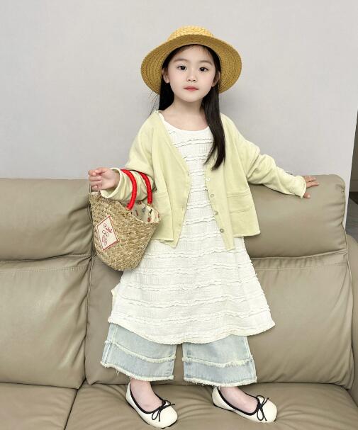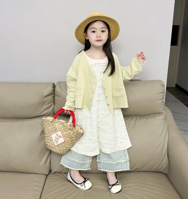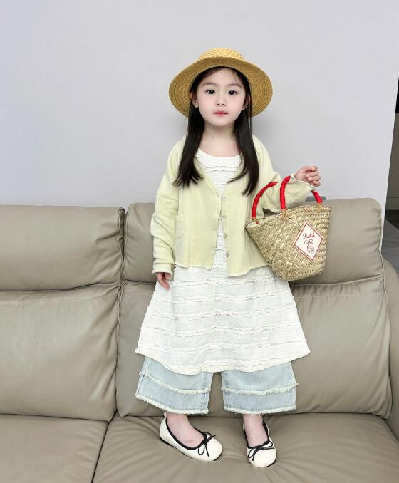 薄手のカーディガンと白いロングワンピース、デニムパンツの組み合わせで春夏コーデが完成。