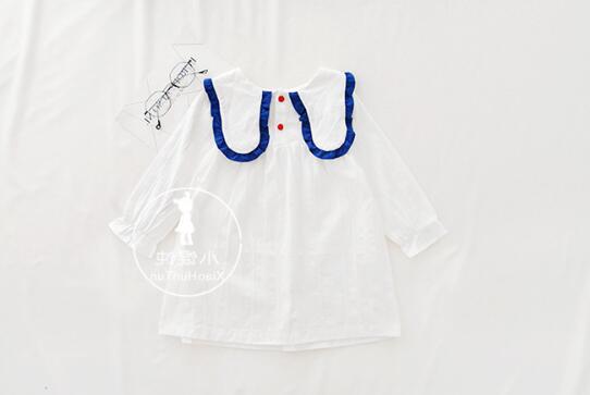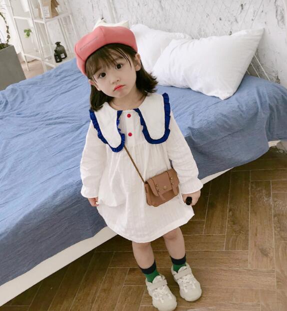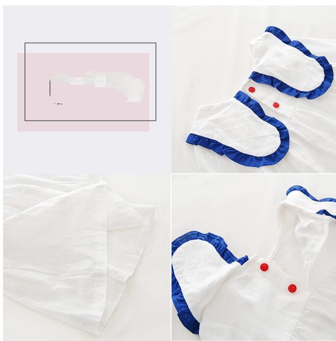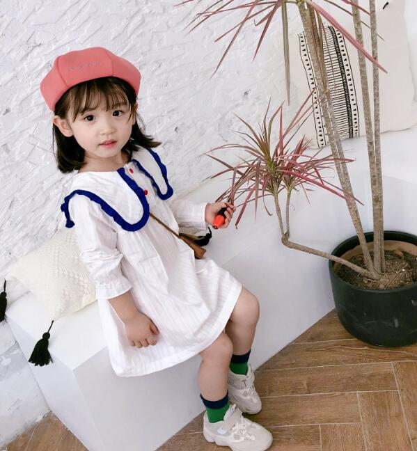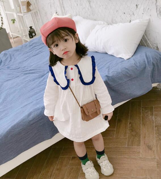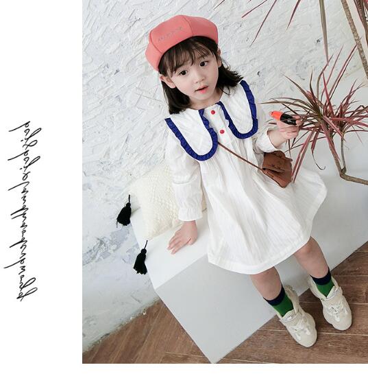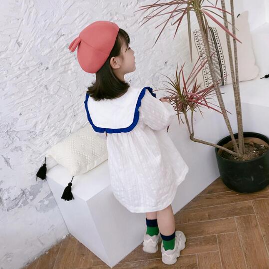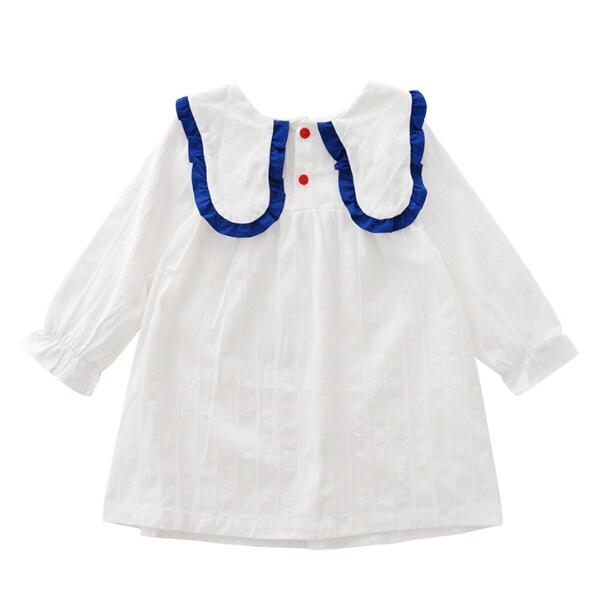 白色をベースに青色の丸襟が印象的な長袖デザインで、膝丈の上品な仕上がりになっています。
