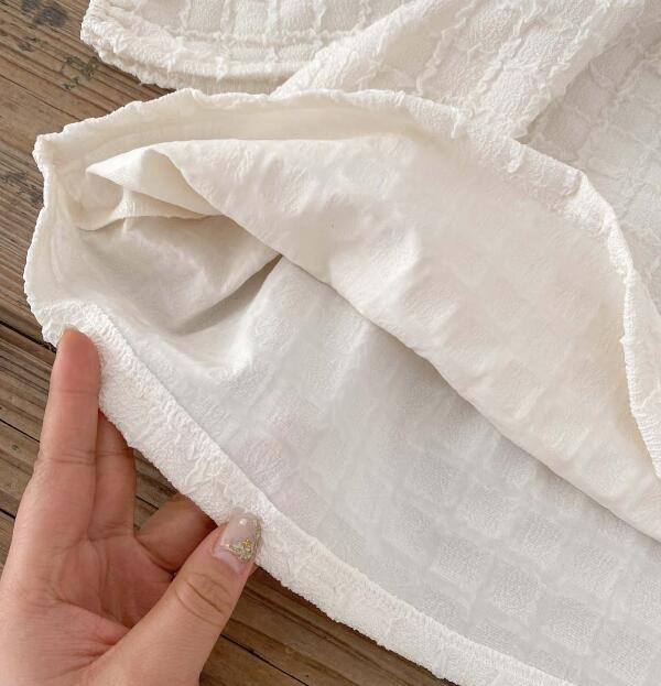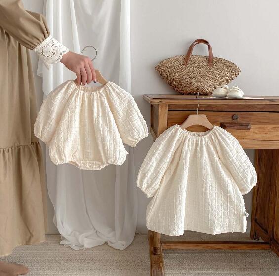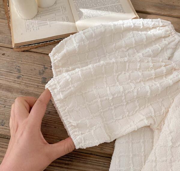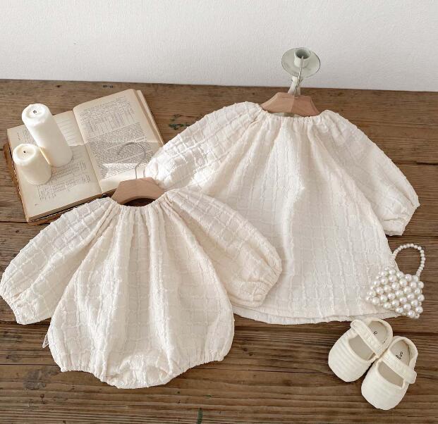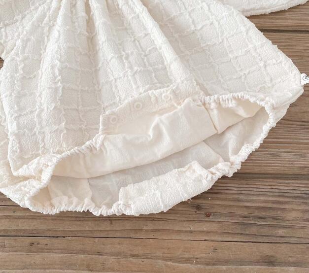 上品な白いレース風素材を使用したキッズ向けの長袖ワンピースです。 袖部分はふんわりとしたバルーン袖で、ロングワンピースのような エレガントなシルエットが特徴的です。 赤ちゃんから幼児まで着用できる、優しい肌触りの一着です。