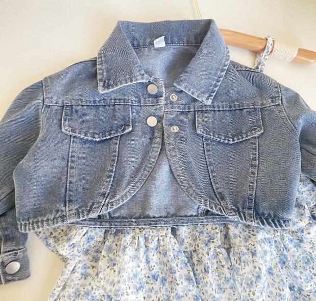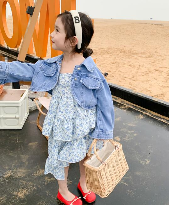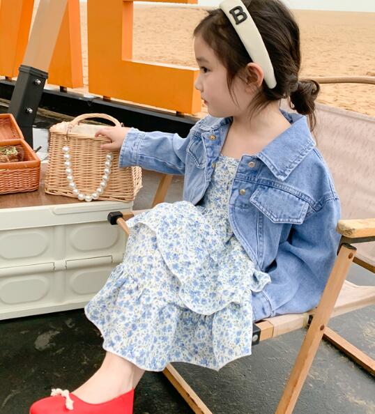 上品な水色の花柄ワンピースは女の子らしい優雅なシルエットで、カジュアルなデニムジャケットとの組み合わせが絶妙です。