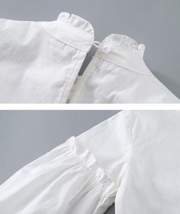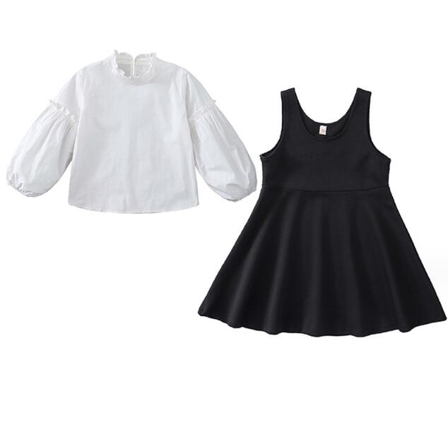 可愛らしいミニ丈のベストワンピースと白シャツのセットアップです。
