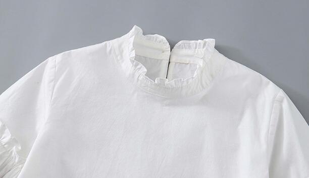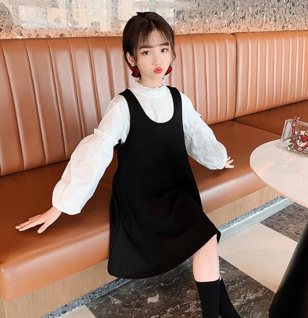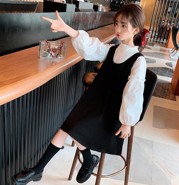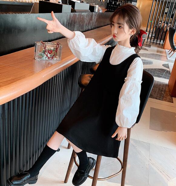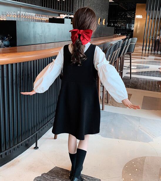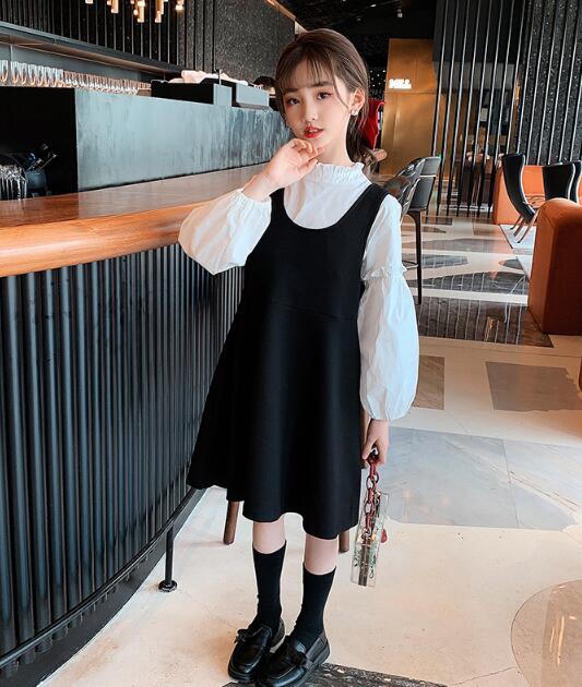 黒のベストワンピースと袖がふんわりとした白シャツの組み合わせが上品で清楚な印象を演出します。
