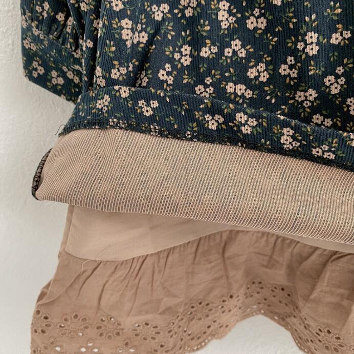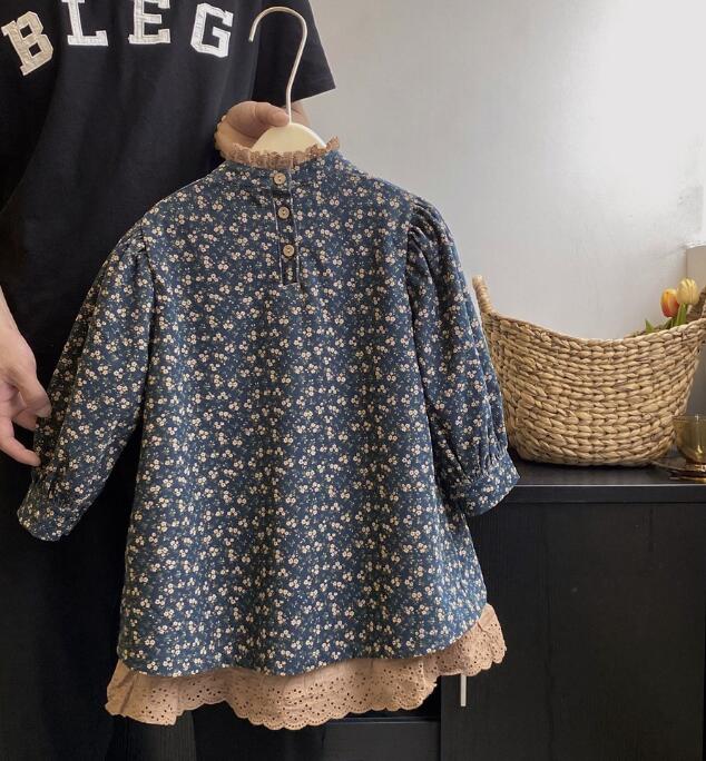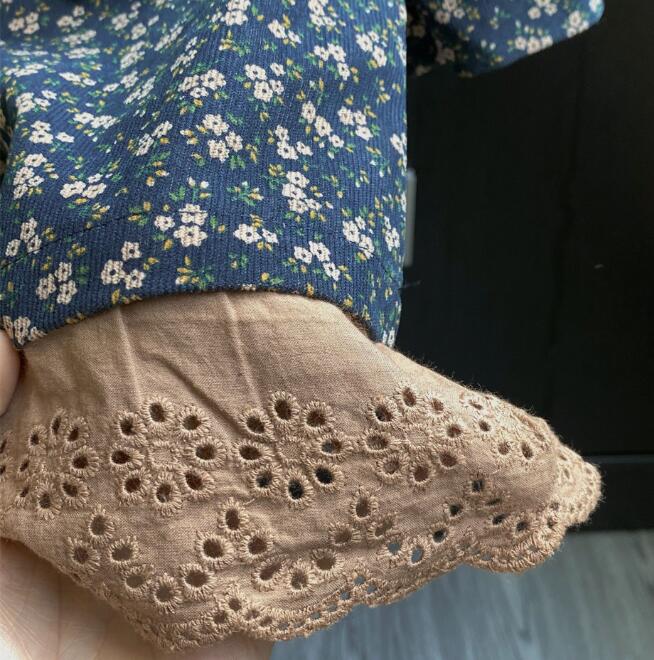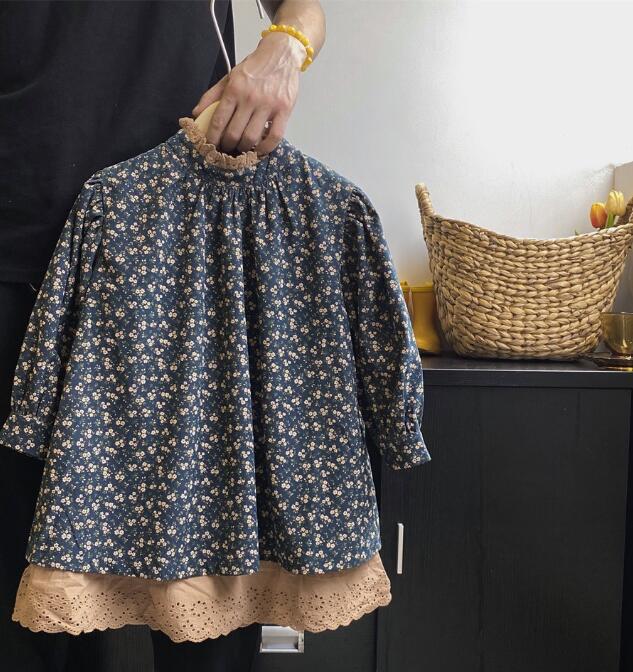 キッズ用の可愛い小花柄ロングワンピースです。 落ち着いたネイビー地に白い小花が散りばめられた上品なデザイン。 裾のレース装飾がエレガントなアクセントを演出します。 長袖仕様で季節を問わず着回しできる万能アイテムです。