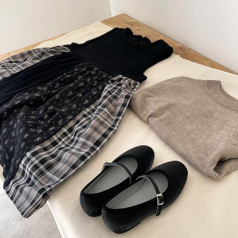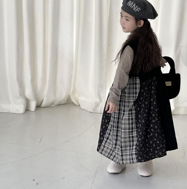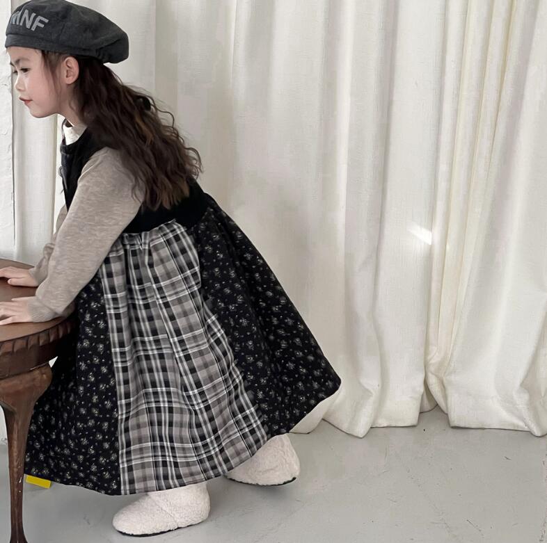 2024年新作のキッズ向けロングワンピースです。 セーターとスカートを重ね着したような可愛らしいデザインで、一枚でおしゃれに決まります。 花柄と格子柄の切り替えが特徴的で、90センチから140センチまでサイズをご用意しております。