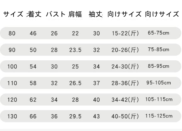 長袖で季節を問わず着用でき、80センチから130センチまで豊富なサイズ展開。