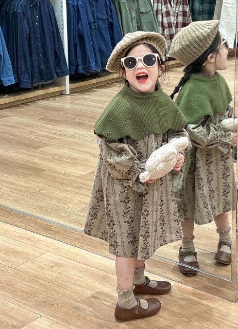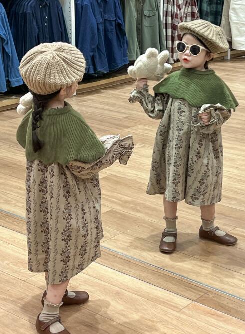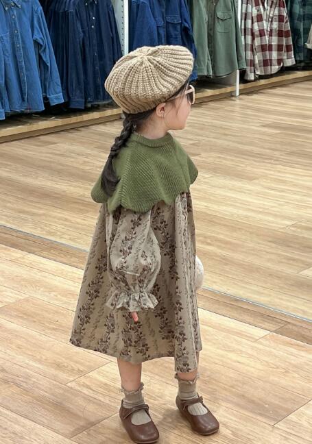 可愛らしい花柄が印象的なキッズ用ロングワンピースです。 上品なグリーンのケープがアクセントになり、おしゃれなコーディネートが完成します。 90センチから140センチまで豊富なサイズ展開で、お出かけや特別な日にぴったりの一着です。