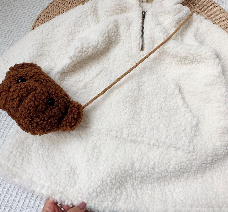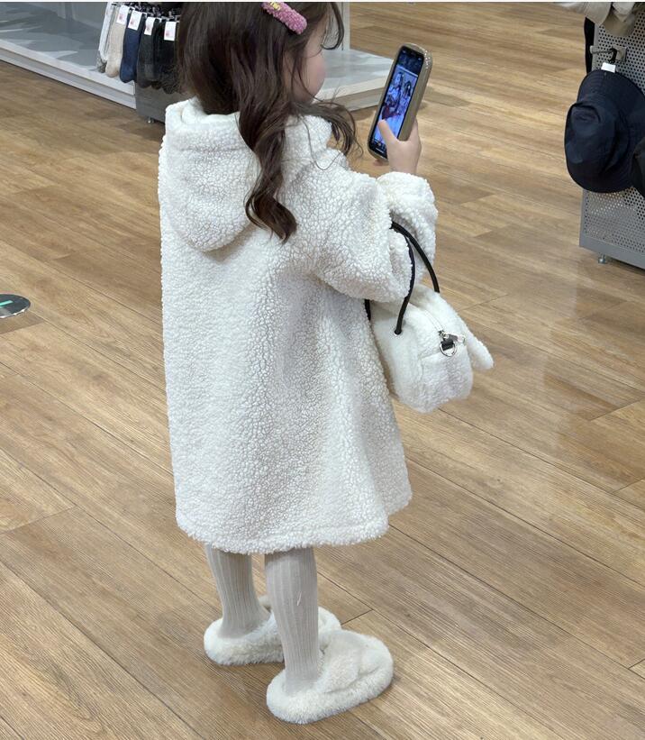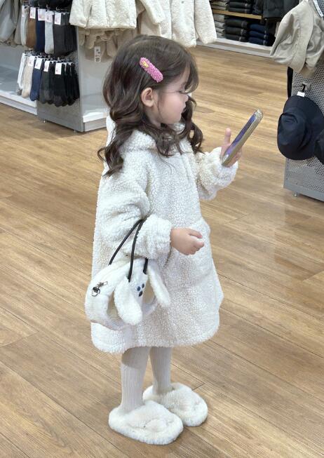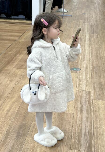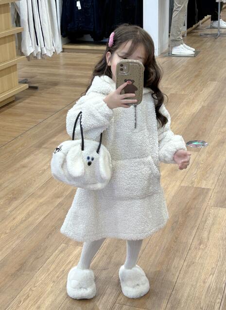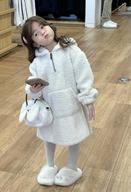 ふわふわもこもこ素材が可愛いキッズ用フード付きワンピースです。