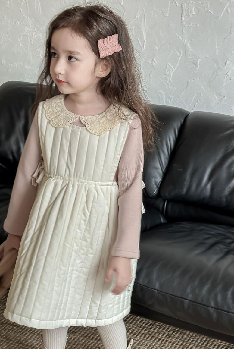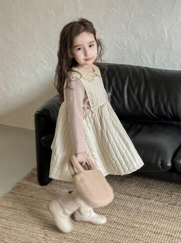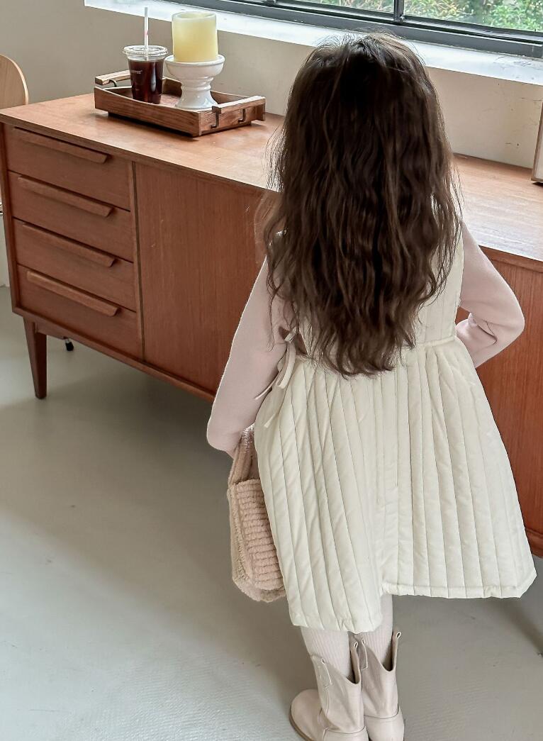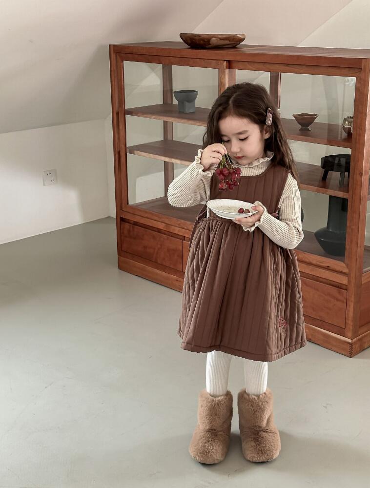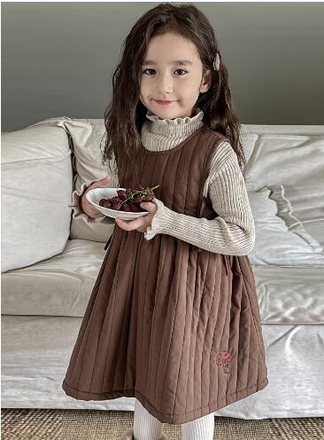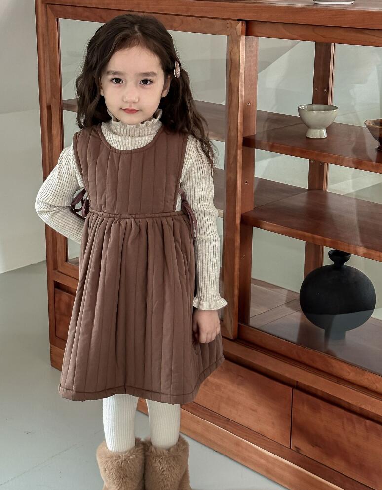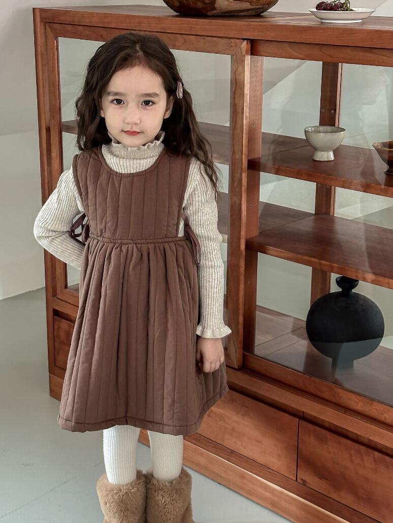 上品なブラウンカラーのジャンパースカート風ロングワンピースで、縦のプリーツデザインが女の子らしい印象を演出します。